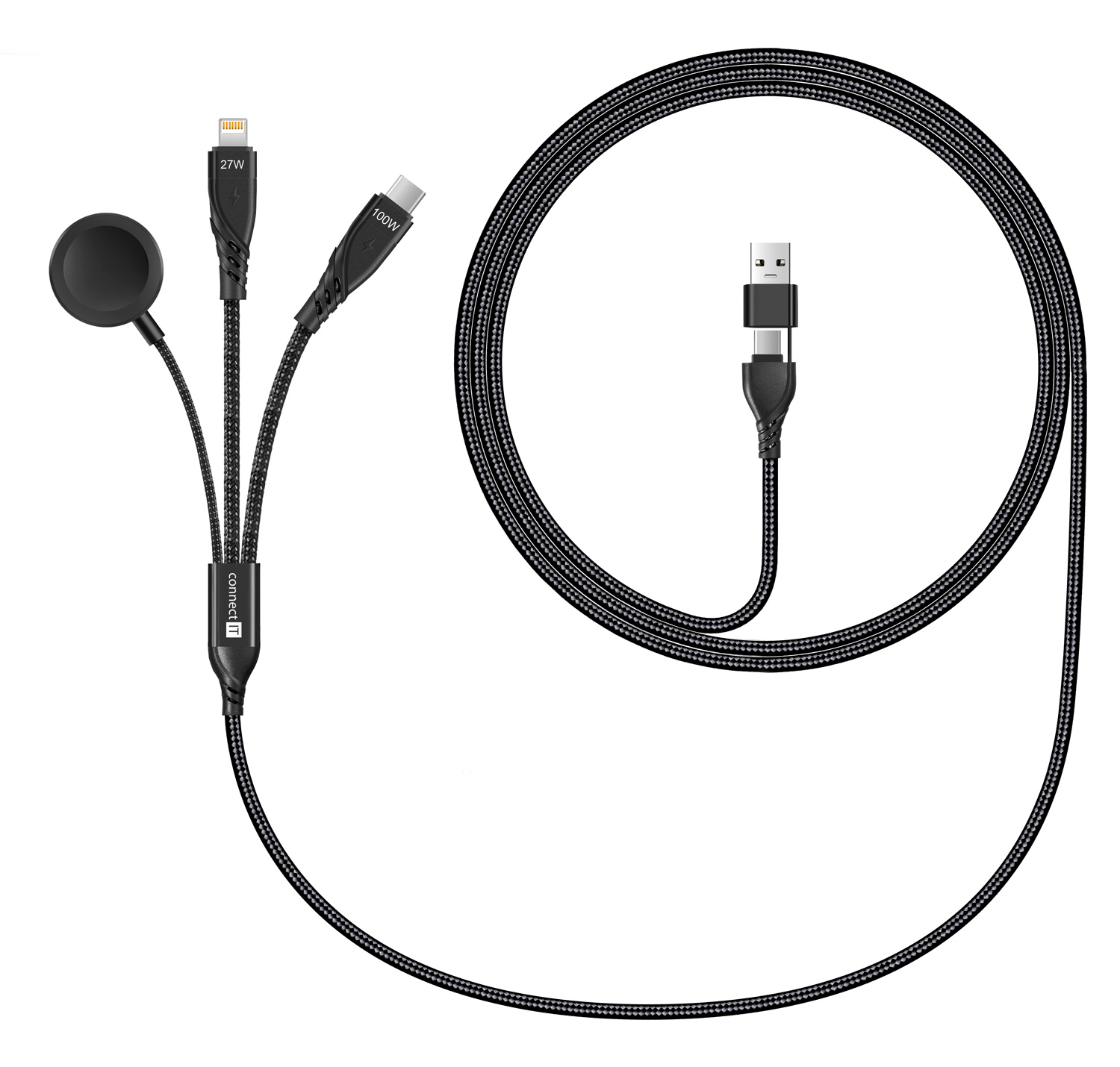 Klíčové vlastnosti: Univerzální nabíjecí kabel 6v1 pro nabíjení zařízení s konektory 1x USB-C, 1x Lightning a 1x nabíječka na chytré hodinky (kompatibilní s Apple Watch) se vstupním konektrom USB-C a redukcí na USB-A. Umožňuje nabíjení až tří zařízení současně s podporou rychlého nabíjení pomocí max. proudového toku 5 A. Speciální manžetová nadstavba konektorů zaručuje lepší přístupnost k nabíjecím zdířkám mobilních telefonů v pouzdrech.