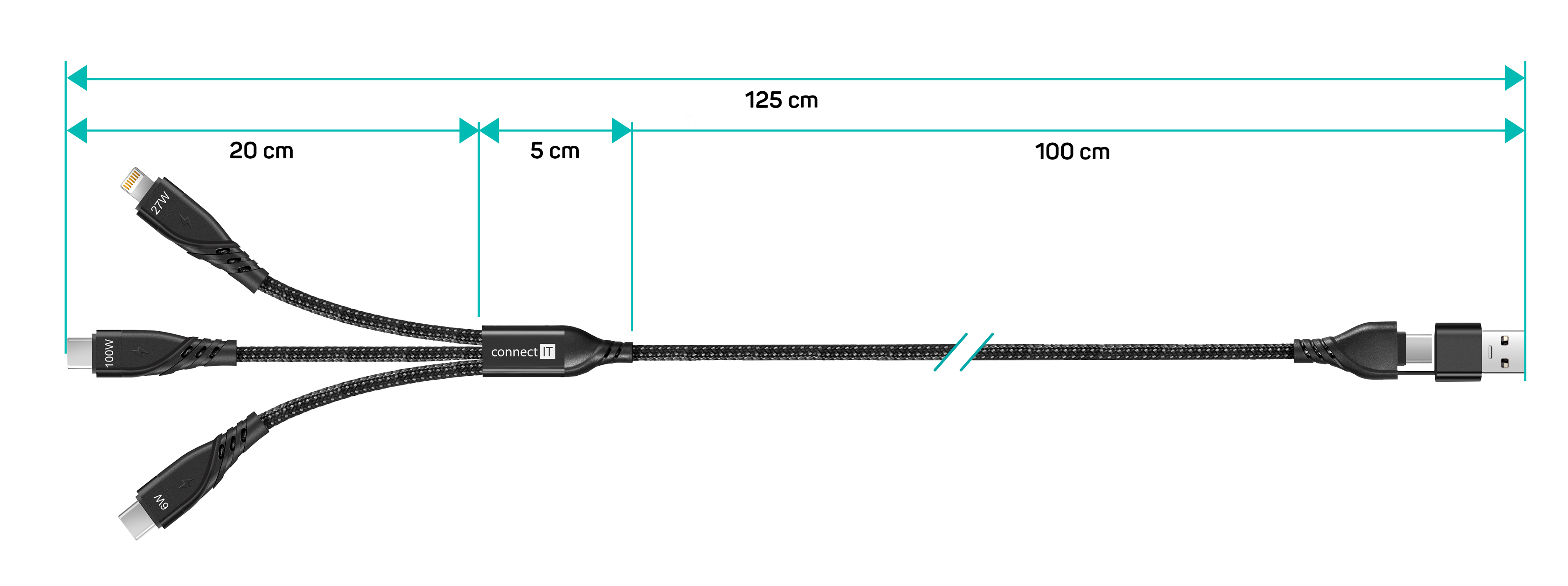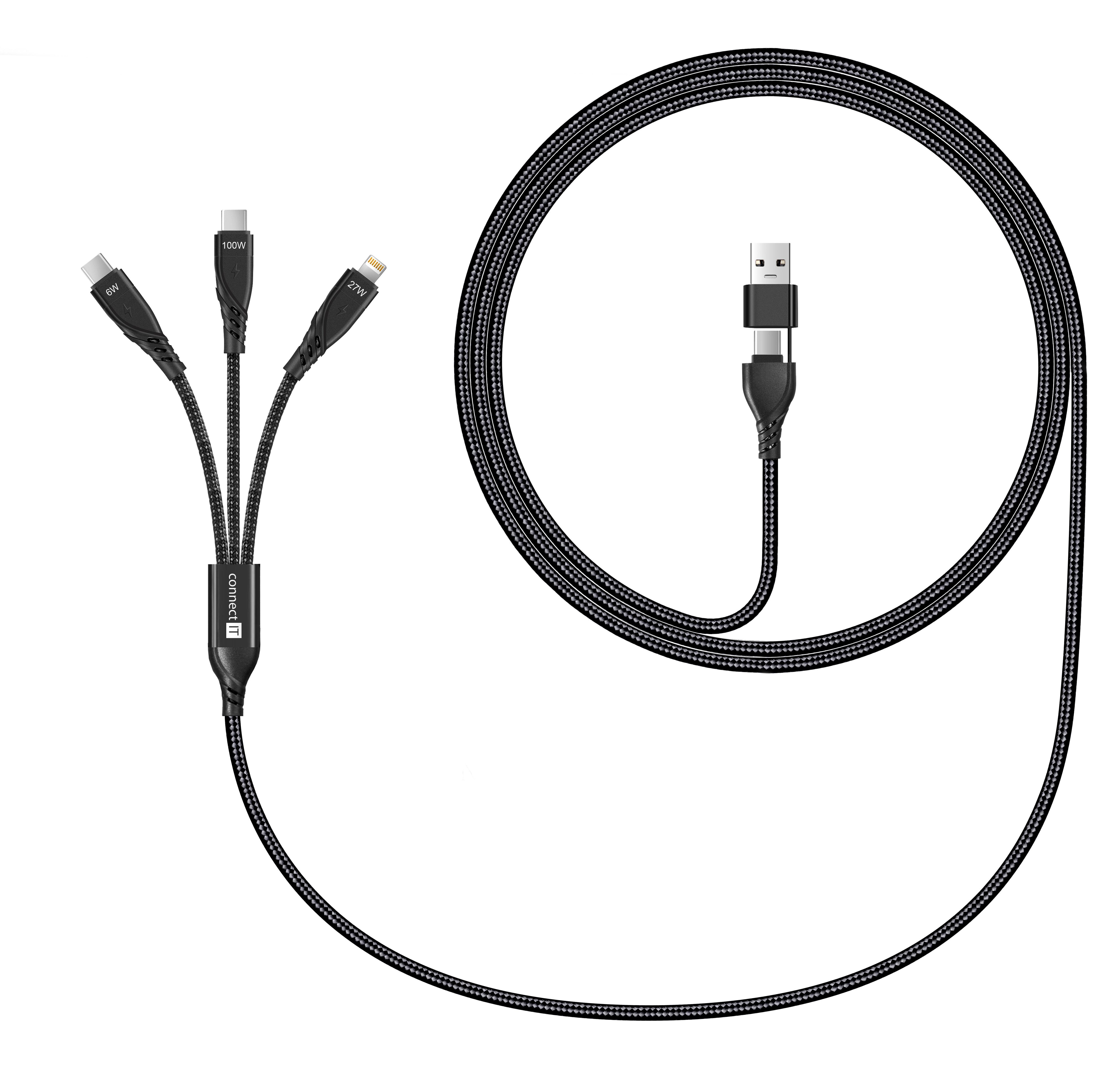Klíčové vlastnosti: Univerzální nabíjecí kabel 6v1 pro nabíjení zařízení s konektory 2x USB-C,1x Lightning se vstupním konektrom USB-C a redukcí na USB-A. Umožňuje nabíjení až tří zařízení současně s podporou rychlého nabíjení pomocí max. proudového toku 5 A. Speciální manžetová nadstavba konektorů zaručuje lepší přístupnost k nabíjecím zdířkám mobilních telefonů v pouzdrech.