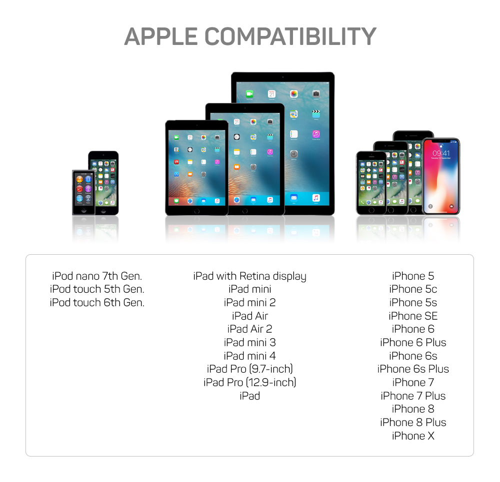 Technické údaje: Plné využití přenosového protokolu AAP (Apple Accessory Protocol) a funkcionality Apple zařízení; Plná kompatibilita s iTunes; Oboustranný Lightning konektor; Rychlé nabíjení a plynulý datový přenos; mobilní telefony Apple iPhone 5/5C/5s; mobilní telefon Apple iPhone SE.
