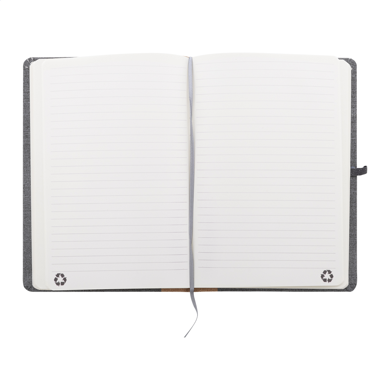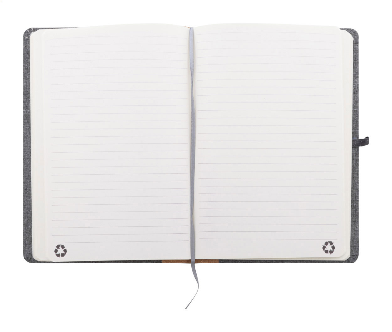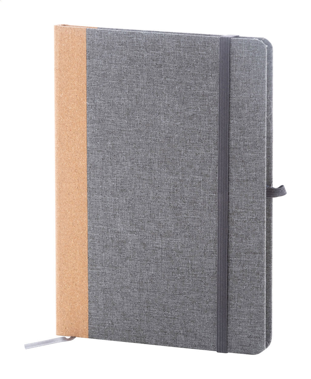 Blok A5 potažený polyesterem RPET s hřbetem z přírodního korku a 80 linkovanými listy z recyklovaného papíru. Se záložkou, gumovým páskem a držákem na pero.