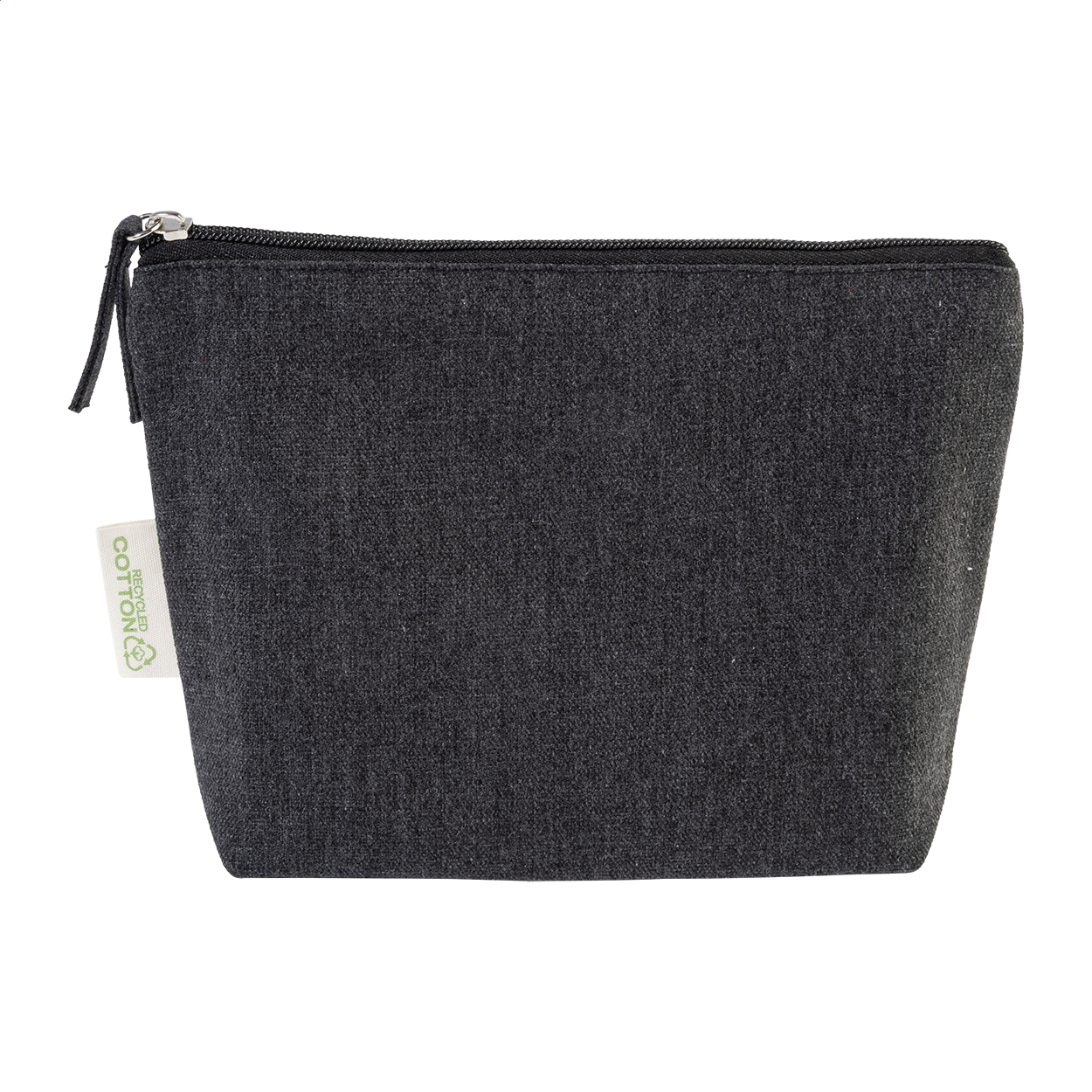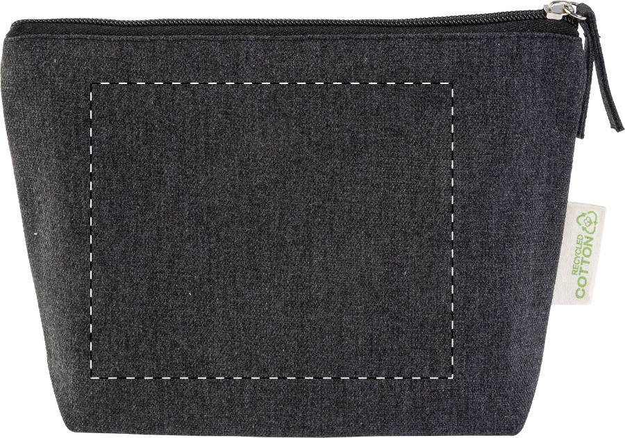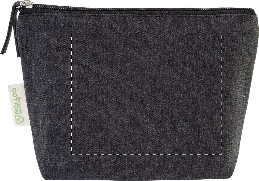Kosmetická taštička na zip ze 70 % recyklované bavlny a 30 % RPET polyesteru, 280 g/m². S výraznou etiketou o recyklované bavlně.