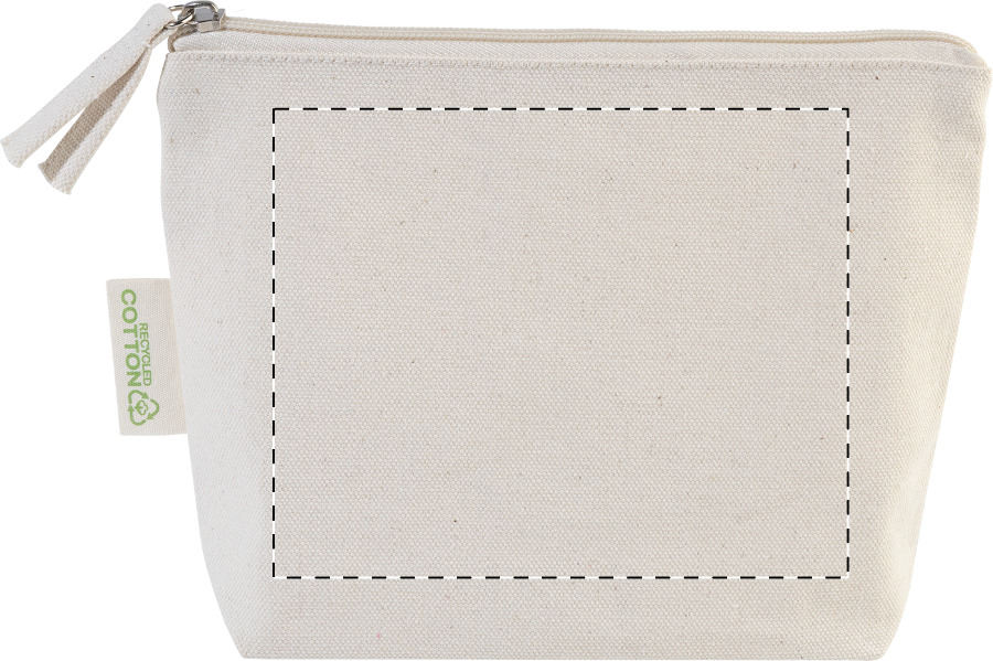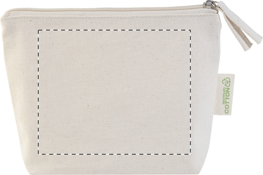 Kosmetická taštička na zip ze 70 % recyklované bavlny a 30 % RPET polyesteru, 280 g/m². S výraznou etiketou o recyklované bavlně.