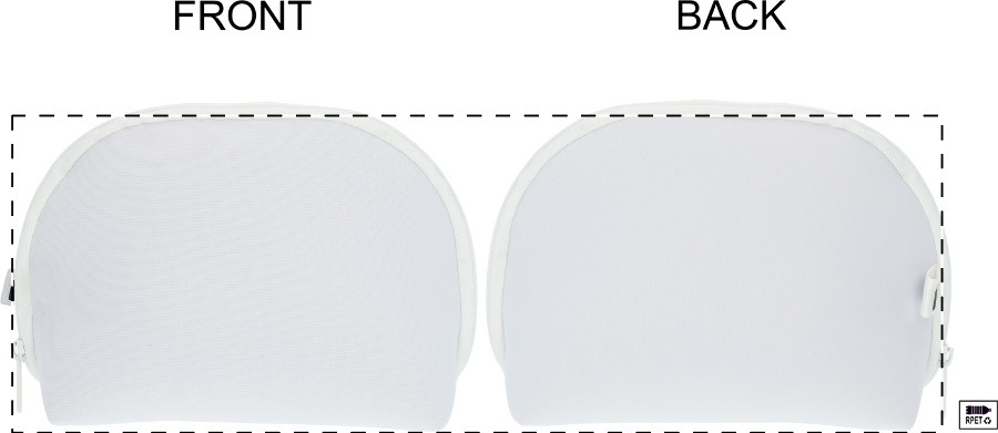 Kosmetická taštička na zip z RPET neoprenu vyrobená na zakázku. S výraznou RPET etiketou a sublimačním potiskem po celém obvodu, cena nezahrnuje tiskovou přípravu. Min. mn.: 50 ks.