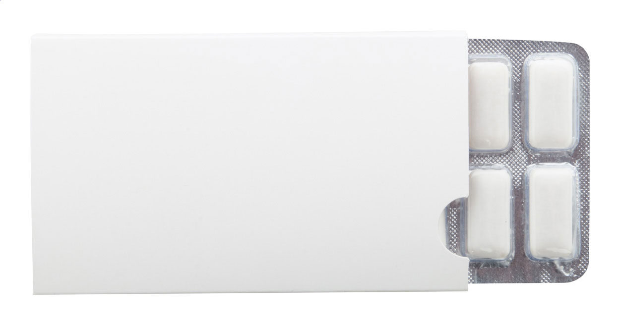 12 ks žvýkaček bez cukru v blistru s celobarevně potištěným papírovým pouzdrem vyrobeným na zakázku. Cena zahrnuje digitální tisk, nezahrnuje tiskovou přípravu. Min. mn.: 100 ks.