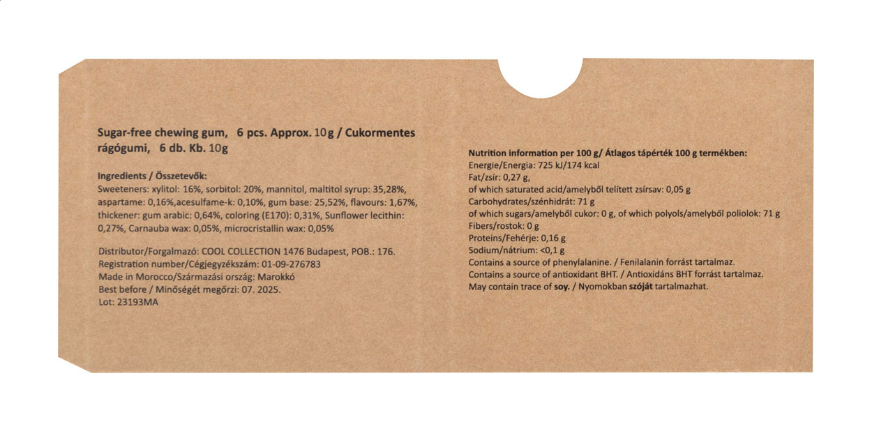 6 ks žvýkaček bez cukru v blistru s barevným potištěným kraftovým papírovým obalem vyrobeným na zakázku. MOQ: 100 ks.