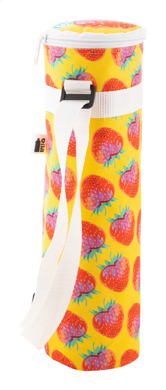 Na zakázku vyrobená chladící taška na láhev na zip z 600D RPET polyesteru s hliníkovou výplní a nastavitelným ramenním popruhem. Ideální pro jednu 1,5l láhev. S celoplošně tištěnou sublimační grafikou a výrazným štítkem RPET, cena nezahrnuje tiskovou přípravu. Min. mn.: 25 ks.