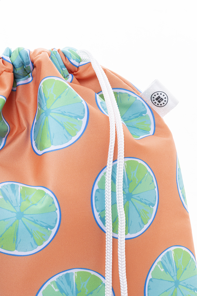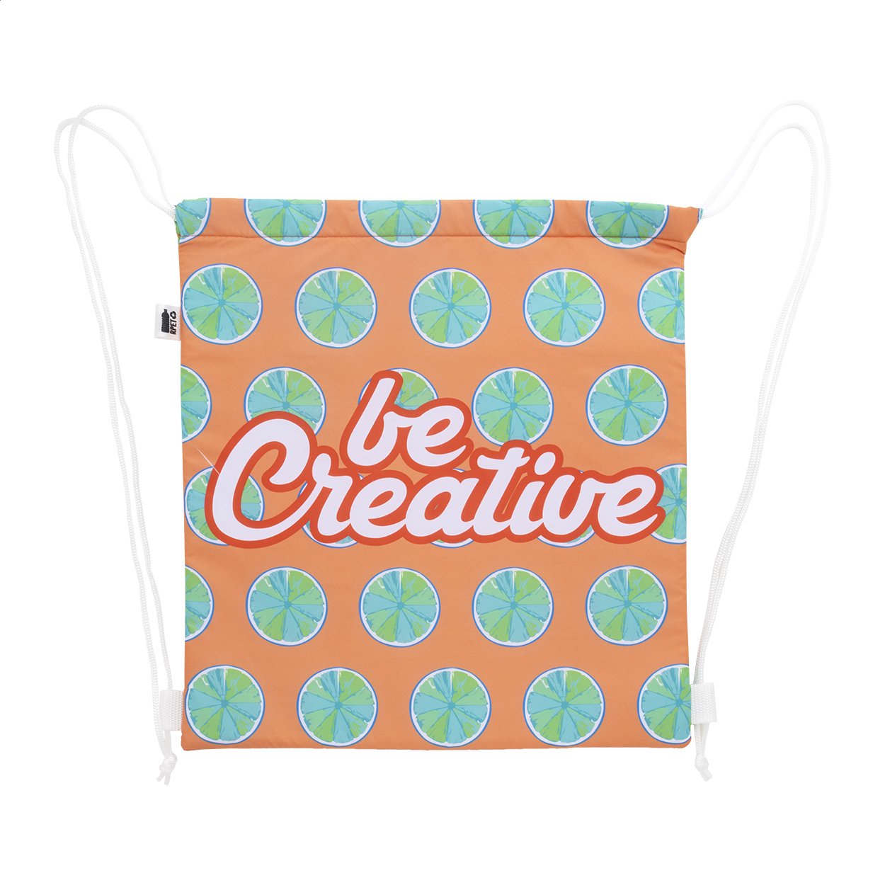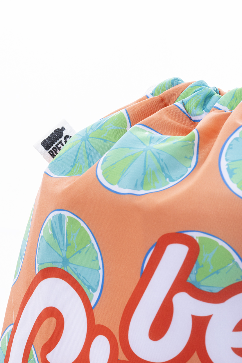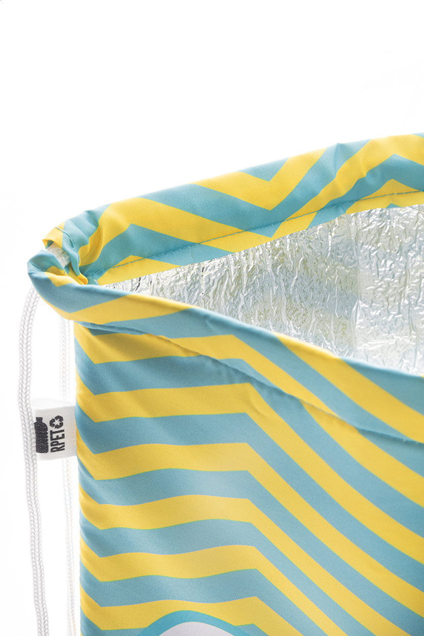 Na zakázku vyrobený chladicí vak se stahovací šňůrkou z 600D RPET polyesteru s hliníkovou výplní. S celoplošně tištěnou sublimační grafikou a výrazným štítkem RPET, cena nezahrnuje tiskovou přípravu. Min. mn.: 25 ks.