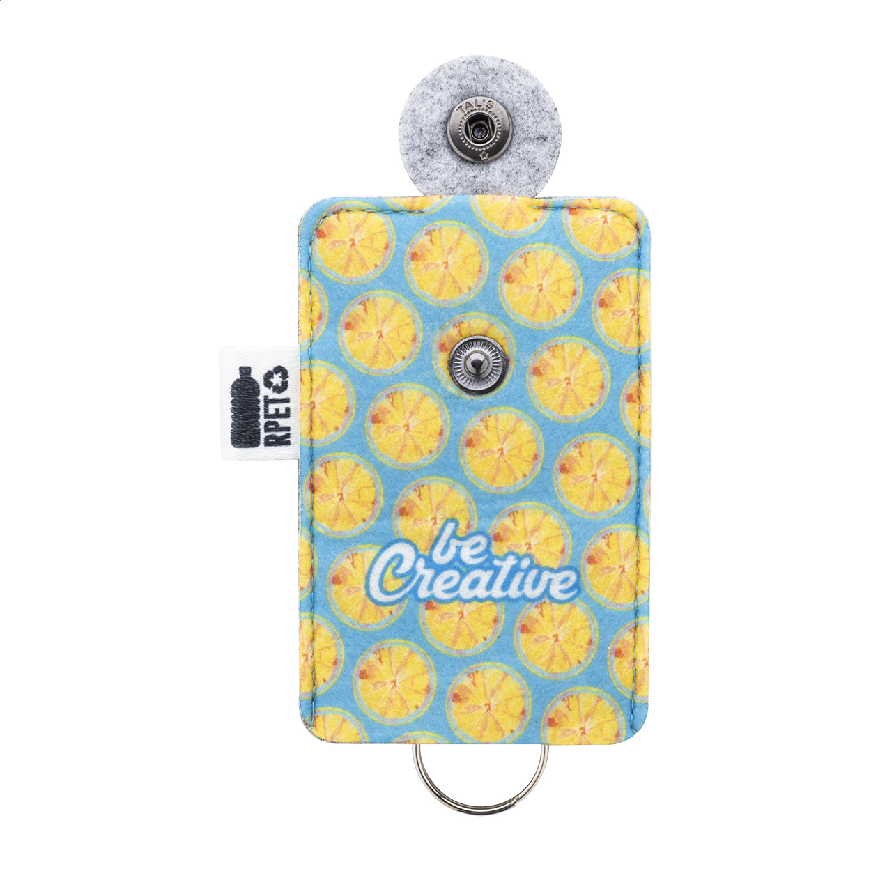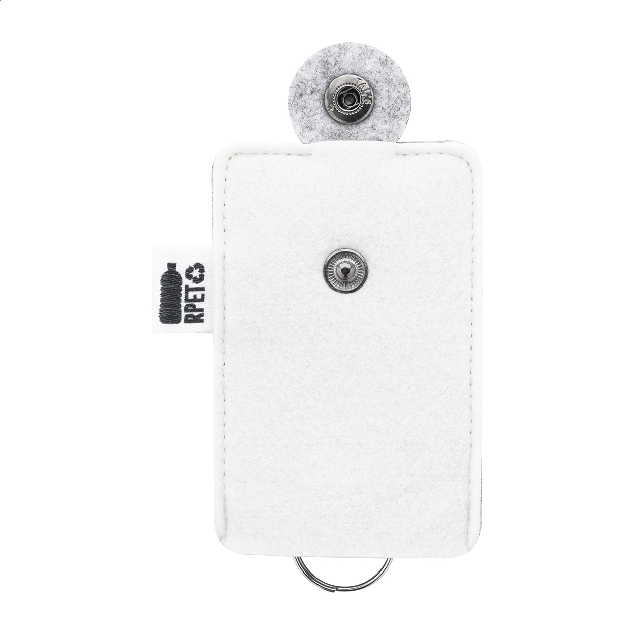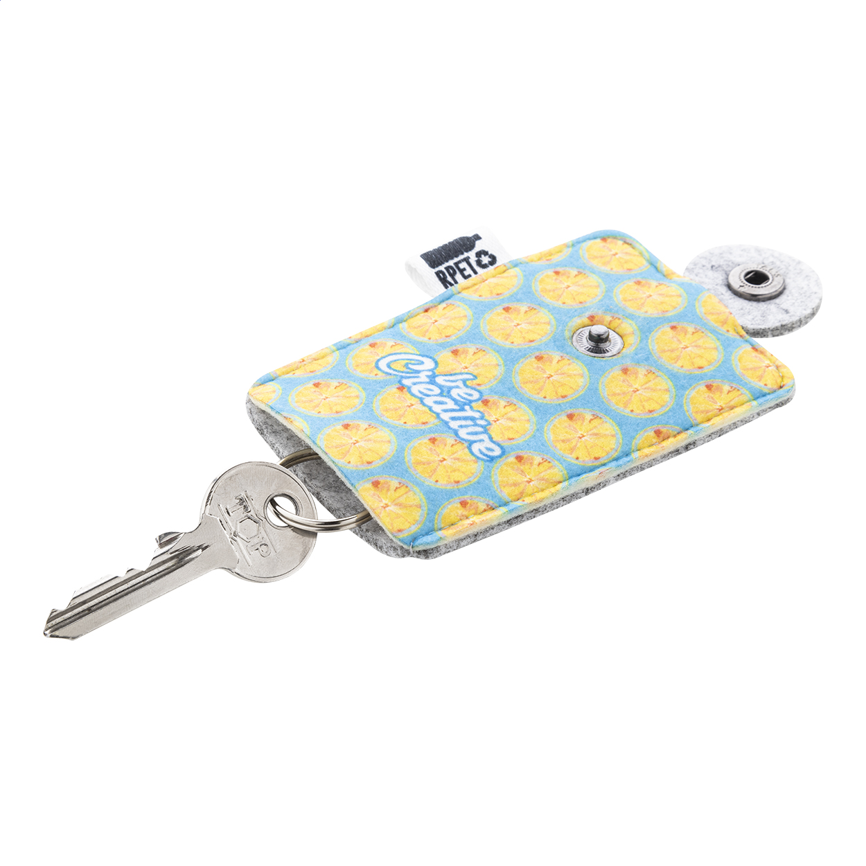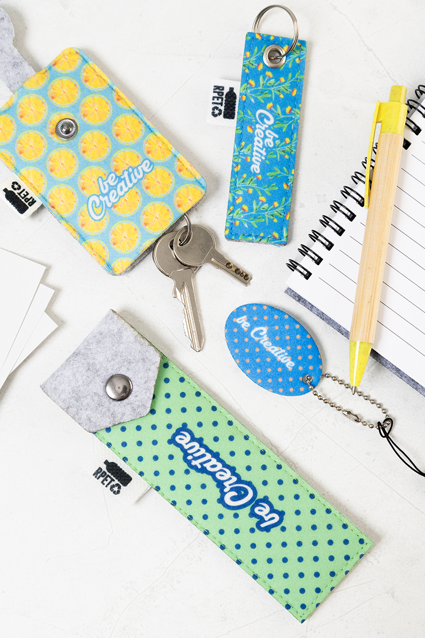 Na zakázku vyrobené pouzdro na klíče z RPET plsti s plnobarevným potiskem na přední straně. S výrazným štítkem RPET. Cena včetně sublimačního tisku, nezahrnuje tiskovou přípravu. Min. mn.: 100 ks.