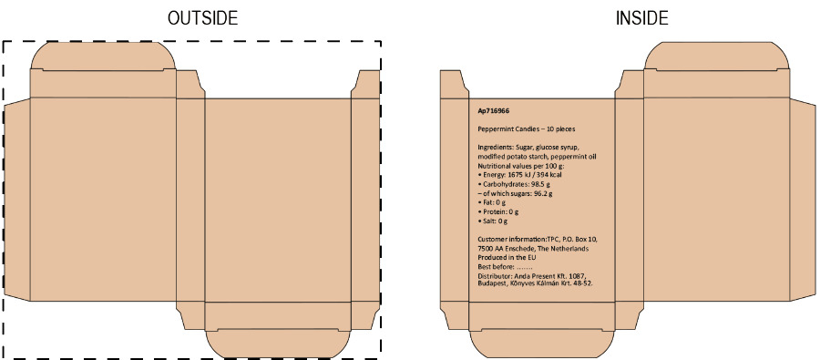 10 ks velkých mátových bonbónů v blistru na zakázku, s plnobarevně potištěnou kraftovou papírovou krabičkou. Cena nezahrnuje tiskovou přípravu. Min. mn.: 100 ks.