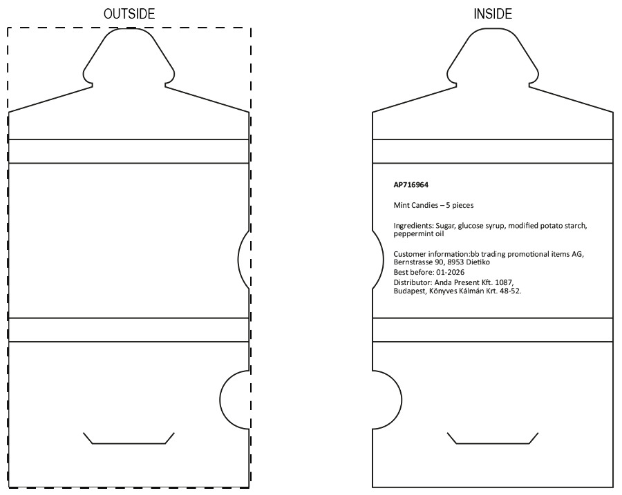 5 ks velkých mátových bonbónů v blistru na zakázku, s barevně potištěným papírovým obalem. Cena nezahrnuje tiskovou přípravu. Min. mn.: 100 ks.
