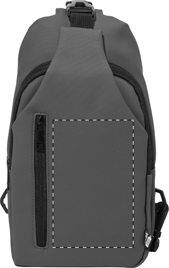 Voděodolná RPET crossbody taška na zavěšení přes rameno s kapsami na zip, zapínáním na přezku a polstrovanými zády. S nastavitelným ramenním popruhem vybaveným polohami na levé a pravé straně. Polyester RPET 600D potažený PU, s výraznou etiketou RPET.