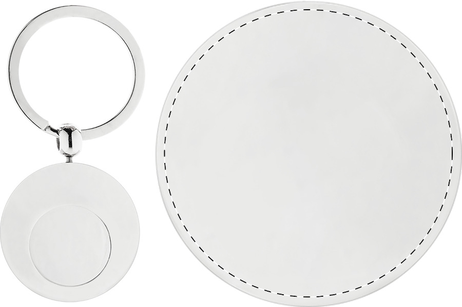 Kulatý kovový přívěsek na klíče se žetonem do nákupního vozíku. V kraftové papírové krabičce.
