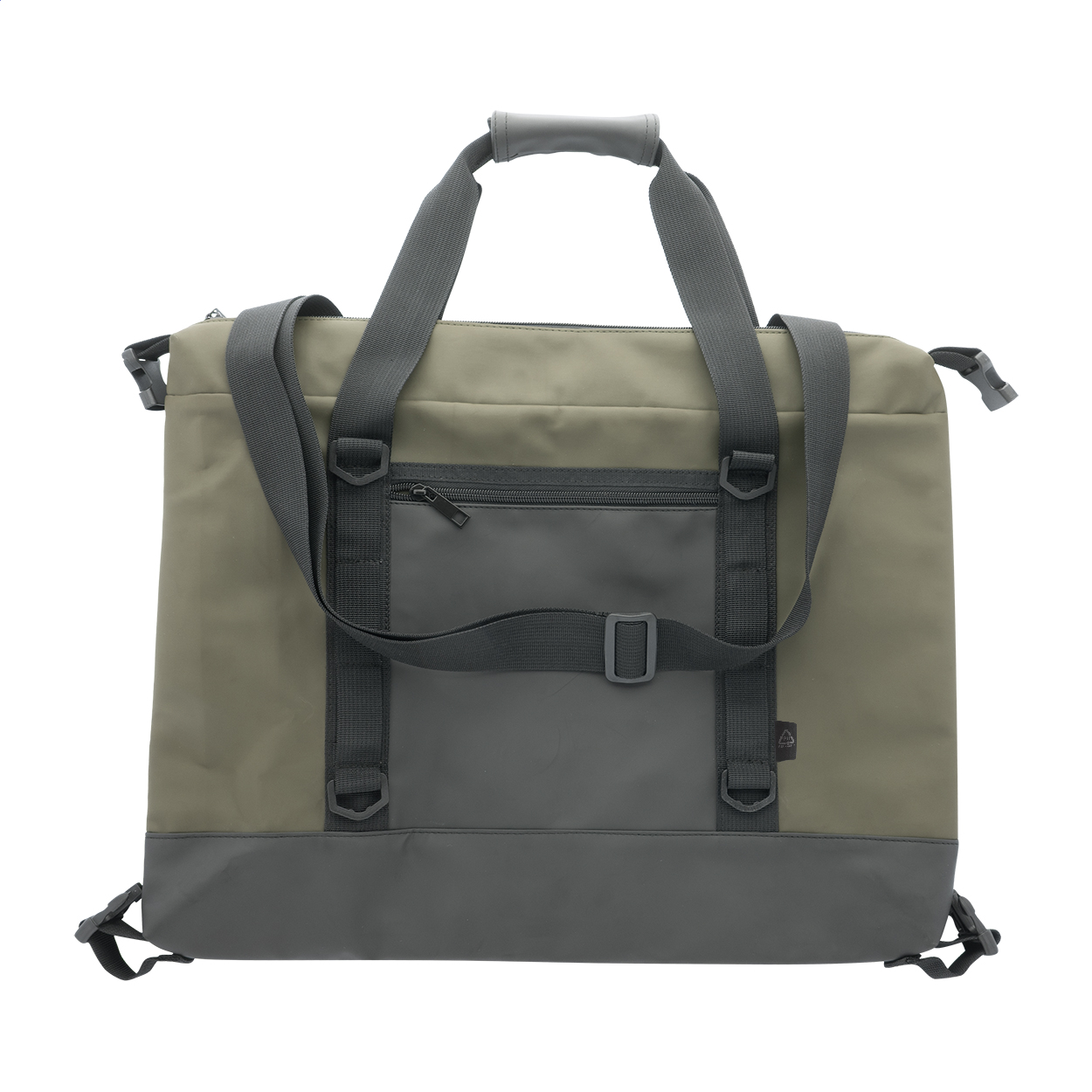 Skládací chladící taška na zip z měkké recyklované PU kůže s hliníkovou výplní a přední kapsou na zip. S bočními přezkami, držadly a nastavitelným ramenním popruhem. Tašku lze složit naplocho pro snadné skladování nebo ji během používání zajistit pomocí bočních výztuh.
