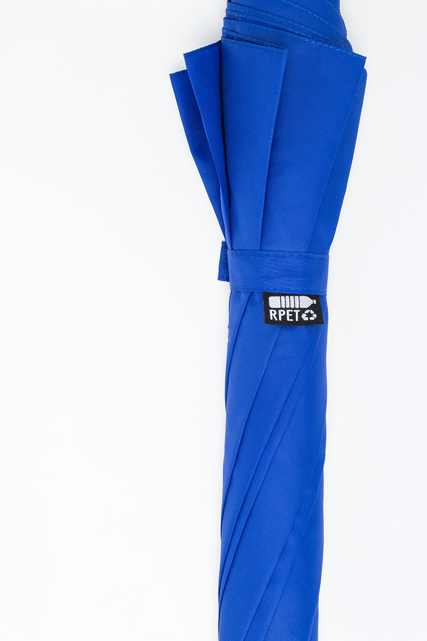 Automatický větruodolný deštník s 8 panely, sklolaminátovým rámem, kovovou tyčí a zakřivenou ABS rukojetí. Pongee 190T RPET. S výrazným štítkem RPET.