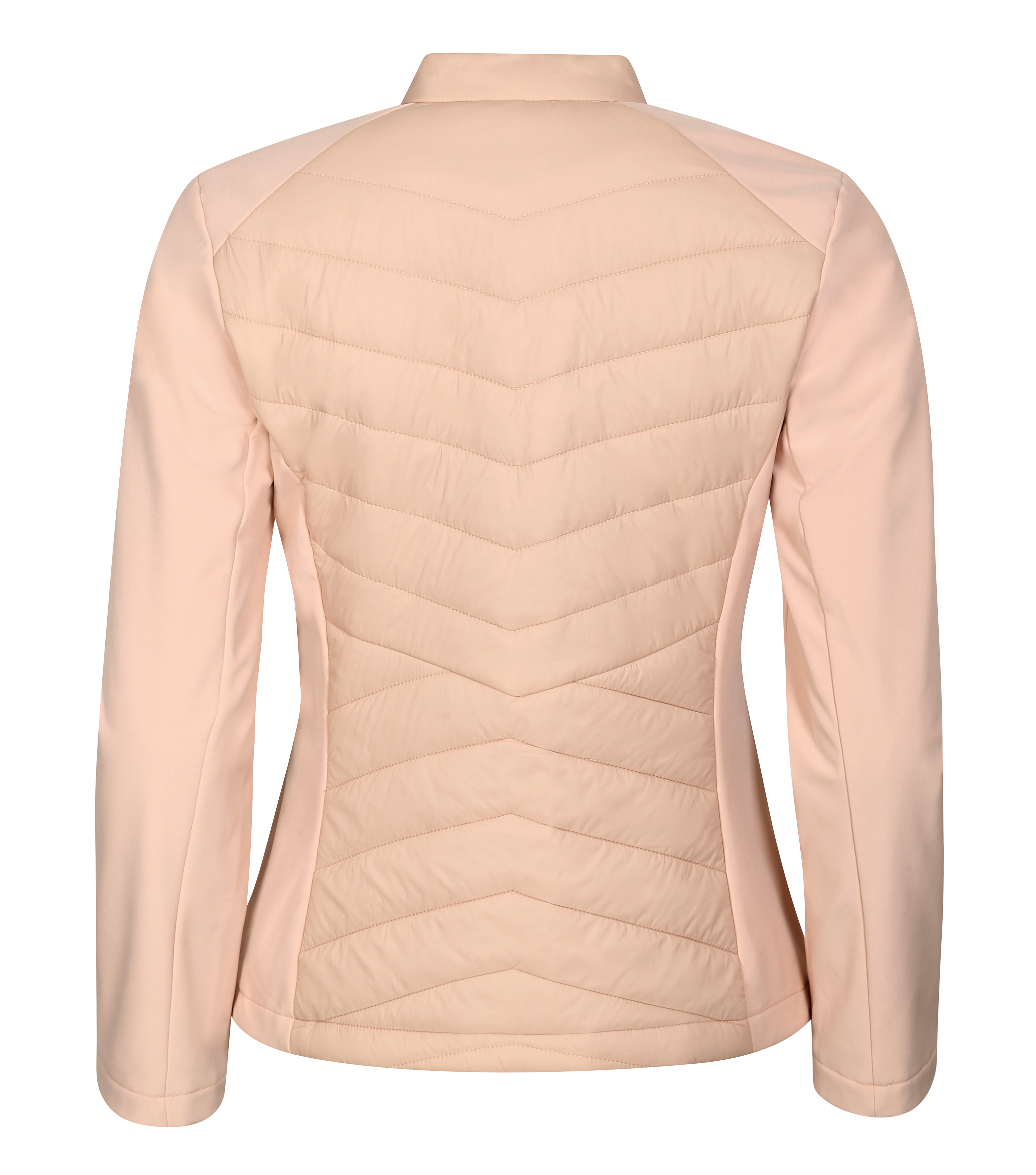 Dámská bunda kombinující prošívaný a softshellový materiál. Bunda má střih tvarovaný bočními díly, stojáček na druk, celopropínací spirálový zip, boční kapsy se spirálovým zipem a vnitřní náprsní kapsu na zip. V podšívce zadního dílu se nachází vstup pro branding.
