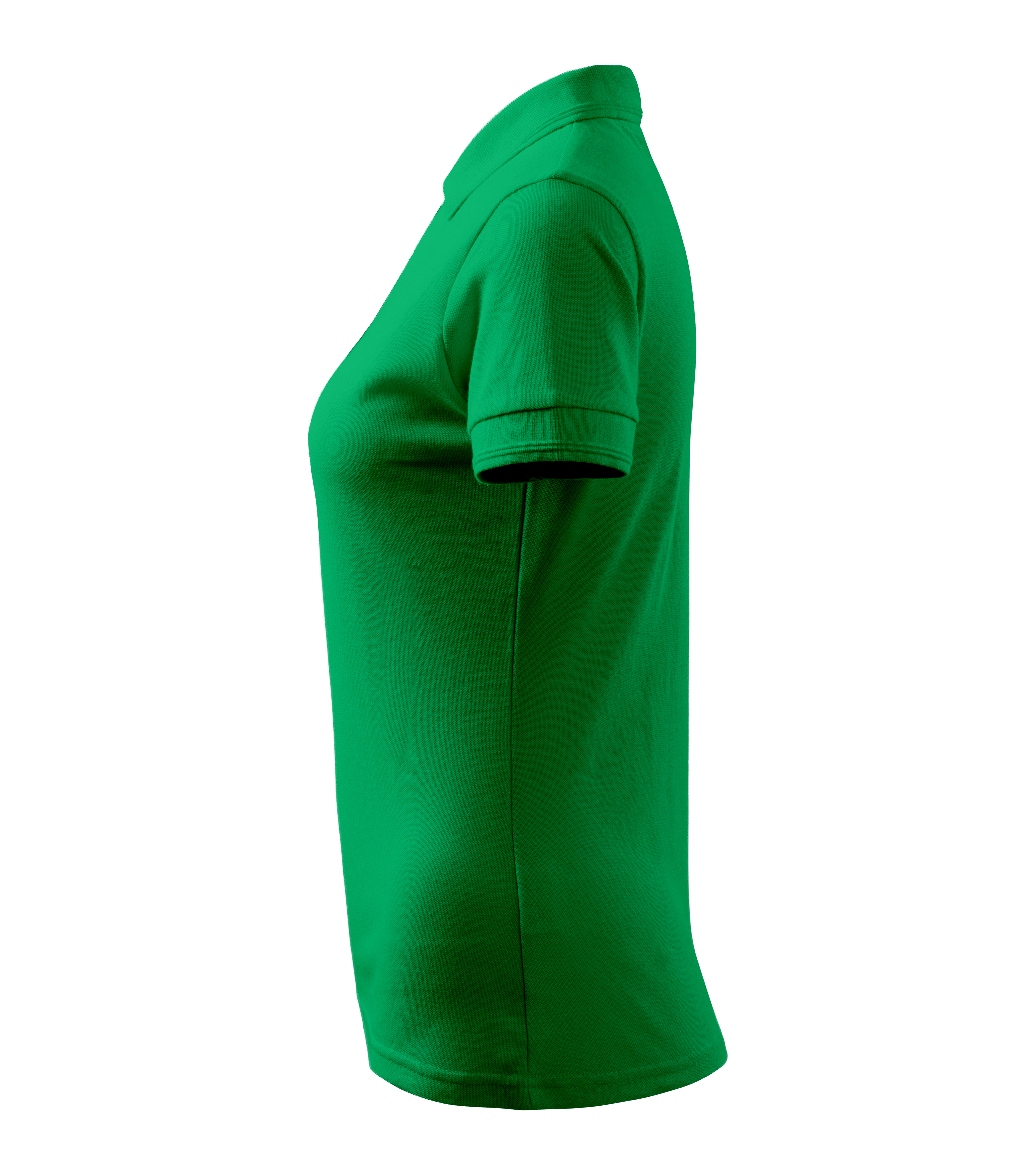 Dámská polokošile s lehce vypasovaným střihem s bočními švy. Límeček a lemy rukávů mají dvojitý reliéfní proužek z žebrového úpletu 1:1. Polokošile má úzkou légu s 5 knoflíčky v barvě materiálu, vnitřní průkrčník začištěný páskou z vrchového materiálu a ramenní švy zpevněné páskou.