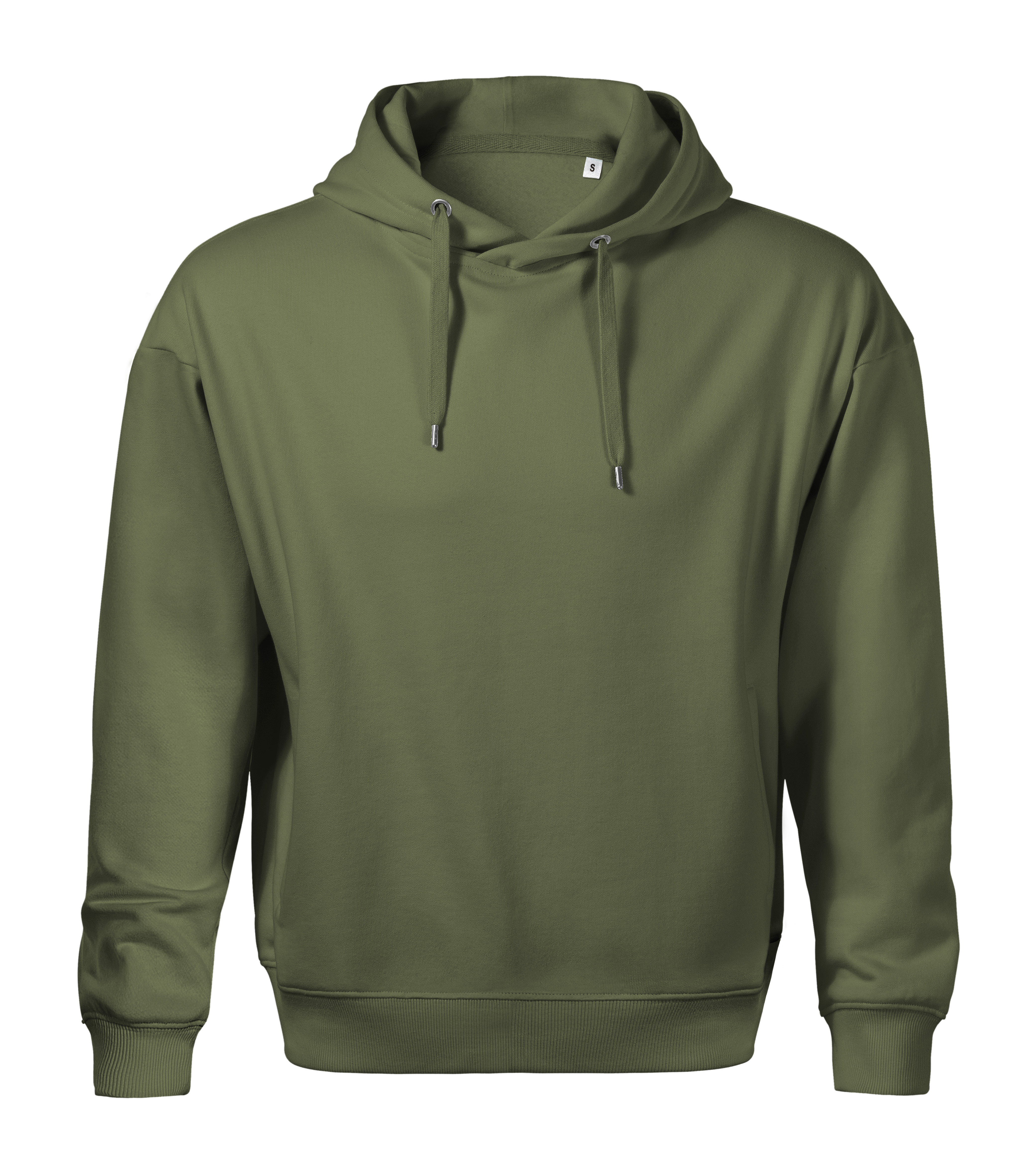 Pánská mikina volného střihu s kapucí s podšívkou a stahovací šňůrkou. Mikina nemá etiketu, pouze malý štítek s označením velikosti v boční části průkrčníku a je tak připravena na rebranding. Mikina má lištové kapsy ve stylu klokanky, počesanou vnitřní stranu, manžety rukávů a dolní lem z úpletu 2:2 s 5 % elastanu. Vnitřní část průkrčníku je začištěna páskou v barvě vrchového materiálu.