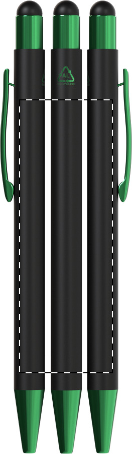 Moderní zelené kuličkové pero z recyklovaného hliníku slouží jako elegantní psací pomůcka i stylus pro dotyková zařízení. Kombinace černého pogumovaného povrchu a lesklých zelených prvků zajišťuje stabilitu při psaní a atraktivní vzhled.