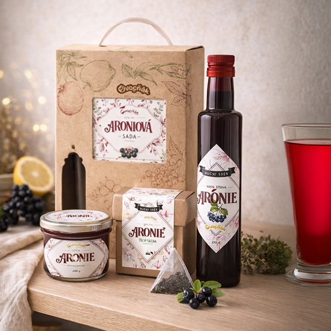 Darujte sílu přírody v podobě arónie, která je známá svým vysokým obsahem vitamínů, minerálů a antioxidantů. Tento set spojuje šťávu, džem a čaj, díky čemuž přináší obdarovaným pestrou paletu chutí i zdravotních benefitů.