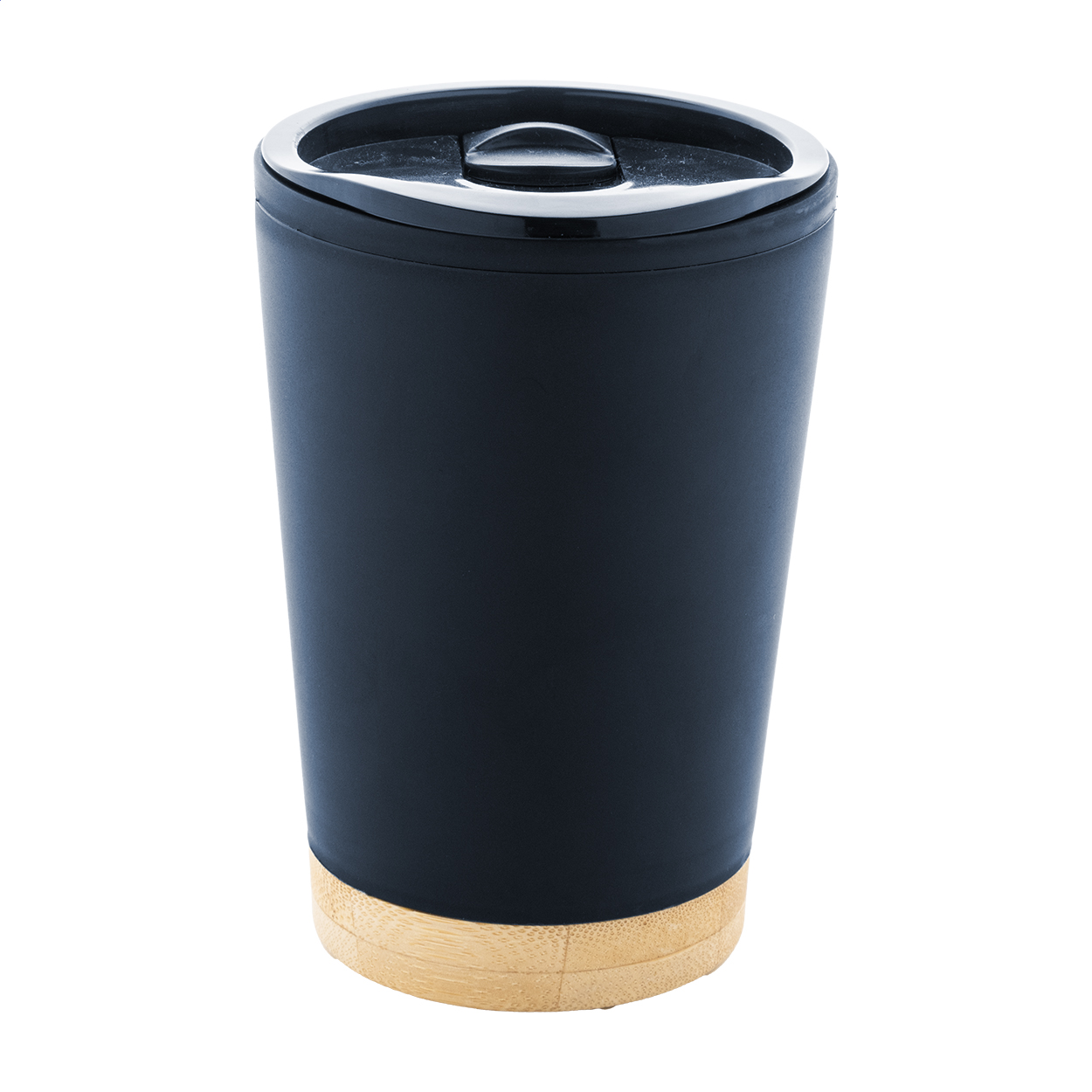 Dvoustěnný termo hrnek izolovaný PP plastem s víčkem na pití a bambusovým dnem, 260 ml.