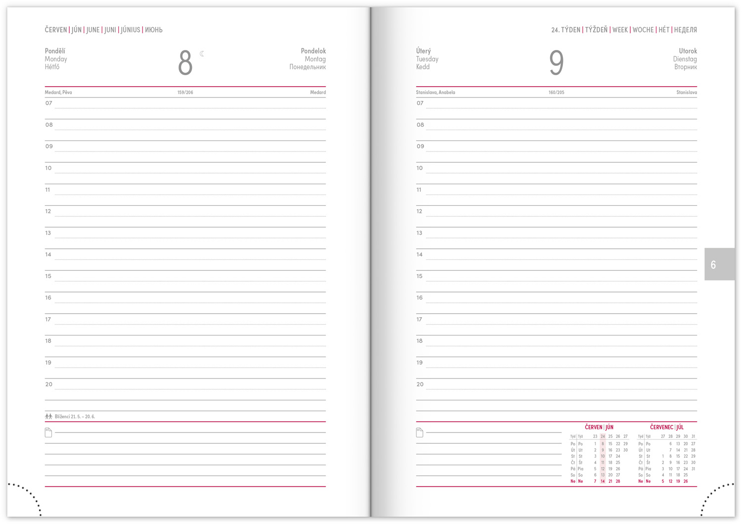 | Provedení diáře | Perforované růžky, Textilní záložka, Poutko na tužku |