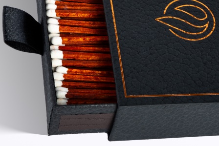 Dlouhé zápalky v krabičce z luxusního strukturovaného černého kartonu vysoké gramáže. Rozměr: 105x105×31,5 mm. Průměrný počet zápalek: 100. Délka zápalky: 94 mm. Standardní zušlechtění: zlatá folie. Barva hlaviček: červená, modrá, zelená, černá, bílá, hnědá. Množstevní tolerance +/- 10 %.