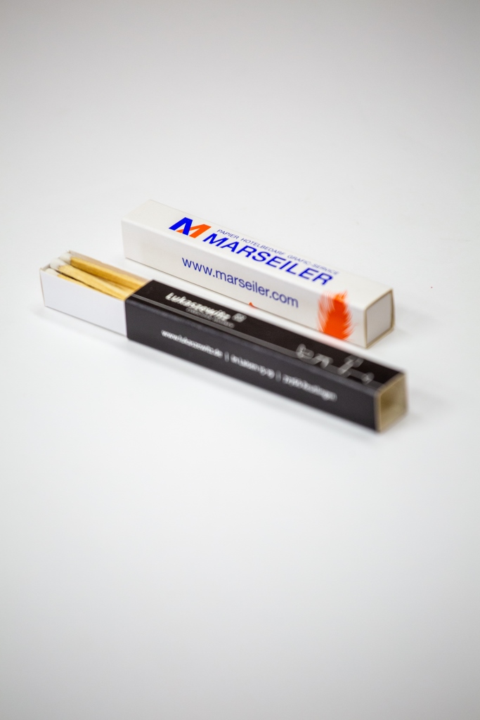 Dlouhé zápalky v papírové krabičce čtvercového průřezu se škrtátkem na jedné straně. Rozměr: 112x17x17 mm. Průměrný počet zápalek: 12. Délka zápalky: 94 mm. Standardní povrchová úprava: uv lak. Barva hlaviček: červená, modrá, zelená, černá, bílá, hnědá. Množstevní tolerance +/- 10 %.