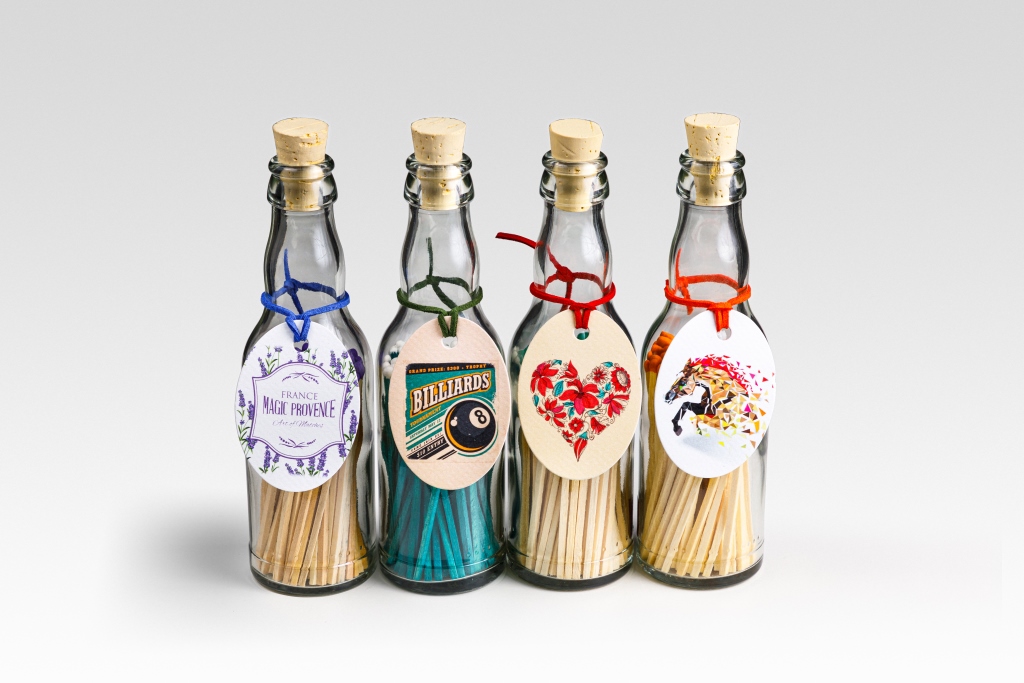 Dlouhé zápalky ve skleněné lahvičce. Rozměr: 195 x Ø 55 mm. Průměrný počet zápalek: 45. Délka zápalky: 95 mm. Množstevní tolerance +/- 10 %.