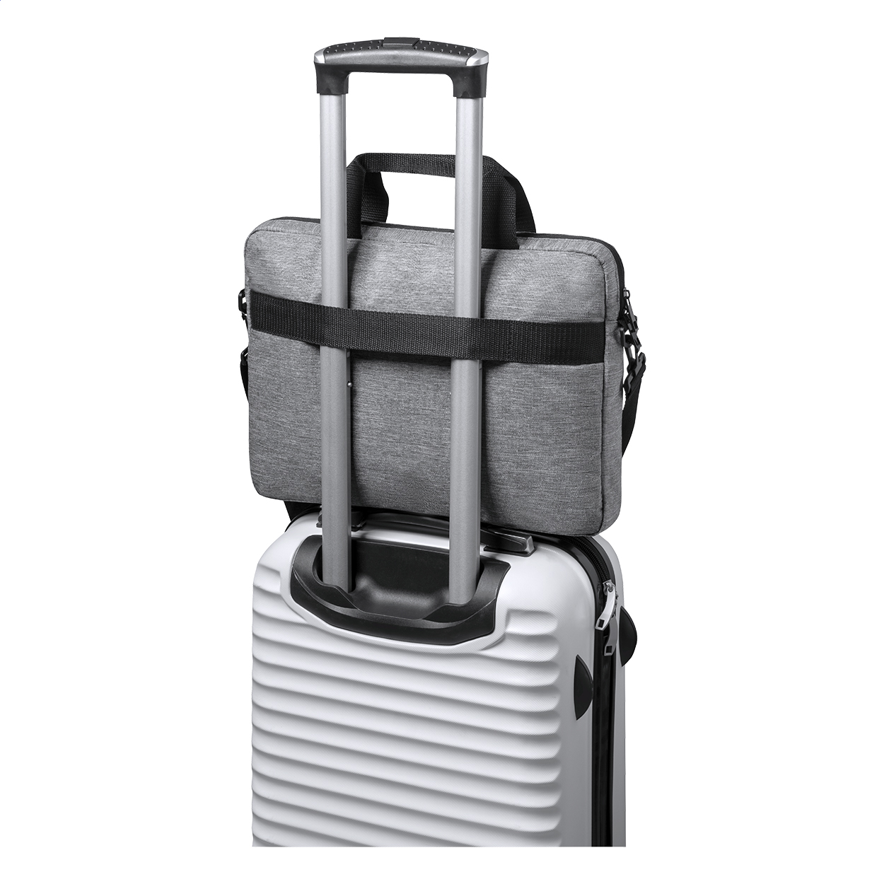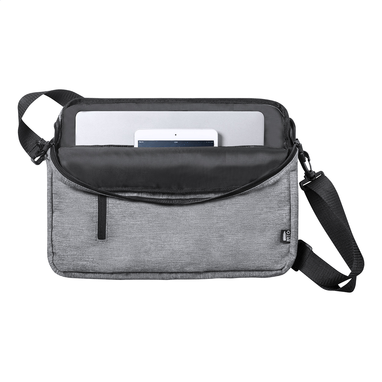 Taška na dokumenty s hlavním oddílem na zip a nastavitelným ramenním popruhem. Taška má popruh pro uchycení na madlo kufru na kolečkách. Uvnitř tašky jsou polstrované přihrádky na 15palcový notebook a 10palcový tablet. 600D RPET (recyklovaný PET) polyester.