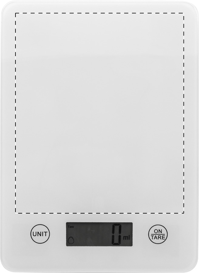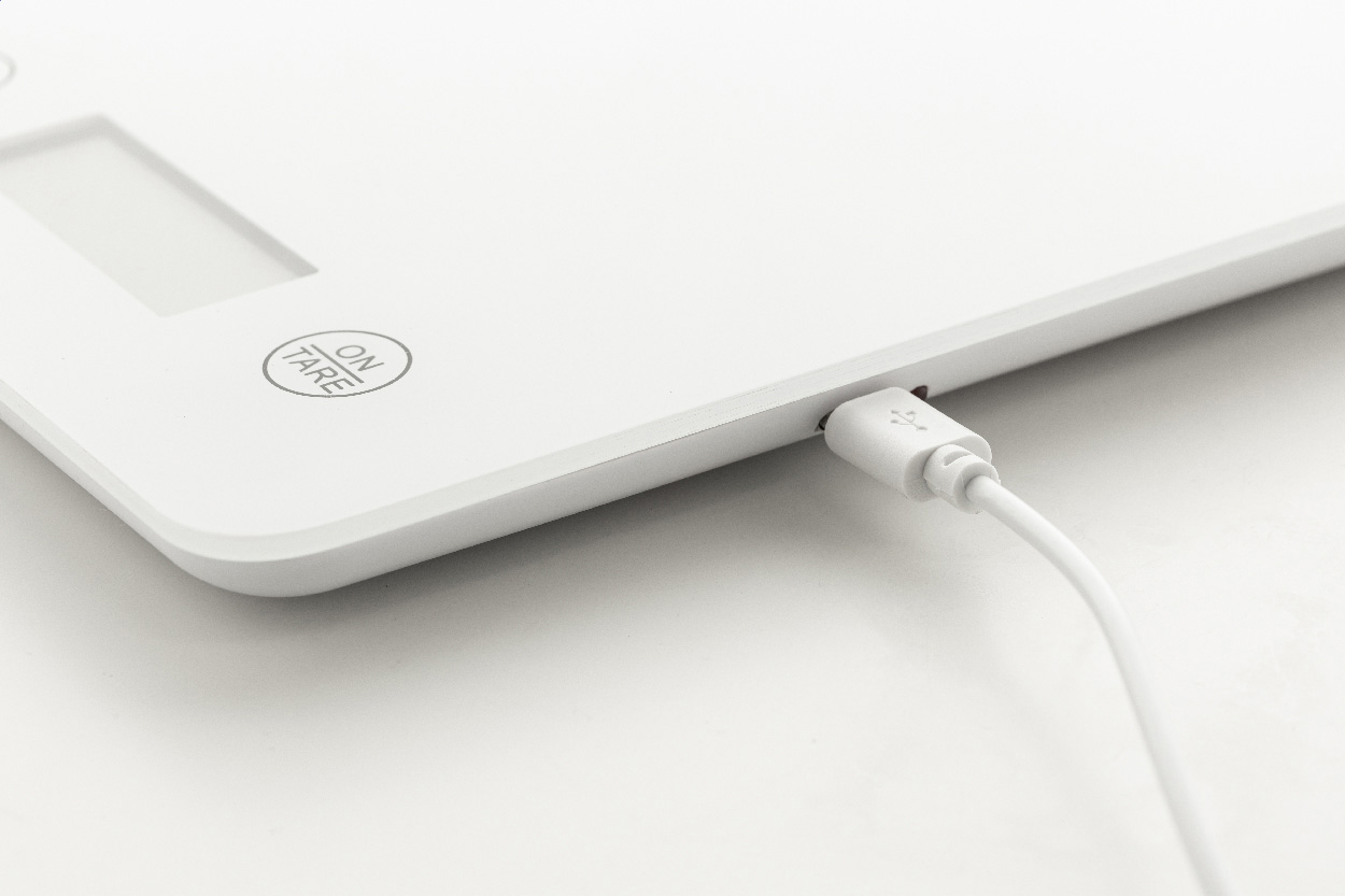 Digitální kuchyňská váha s vážicí plošinou z tvrzeného skla a vestavěnou dobíjecí baterií přes USB (200 mAh). Kapacita: 5 kg, stupnice 1 g, jednotky měření: g/oz. S indikátorem vody/mléka ml. Včetně nabíjecího kabelu USB.