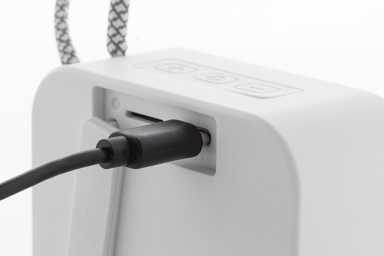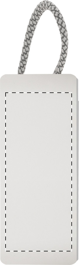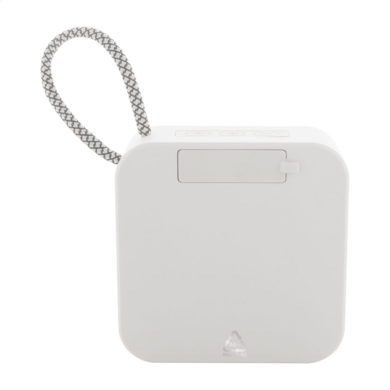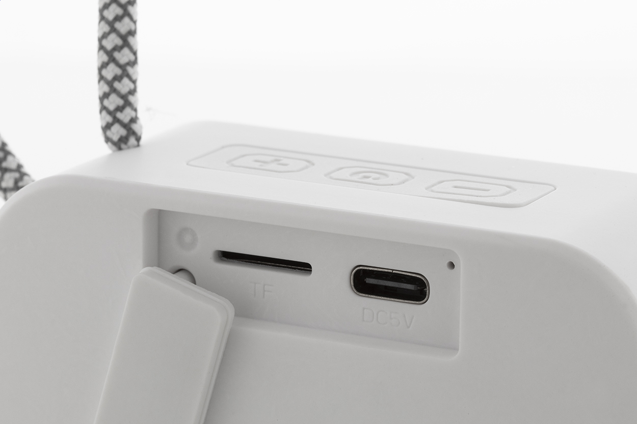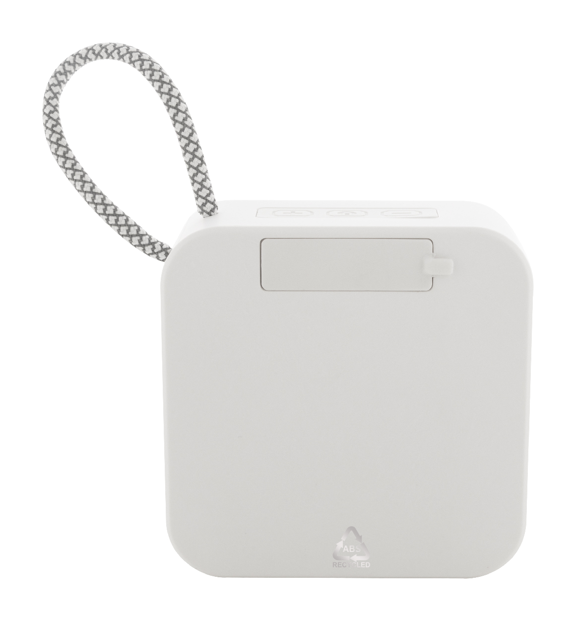 Bezdrátový reproduktor z recyklovaného ABS s popruhem na nošení, kovovou síťovinou a dobíjecí baterií (300 mAh). S funkcí přehrávání MP3 karet micro SD. Včetně nabíjecího kabelu USB.