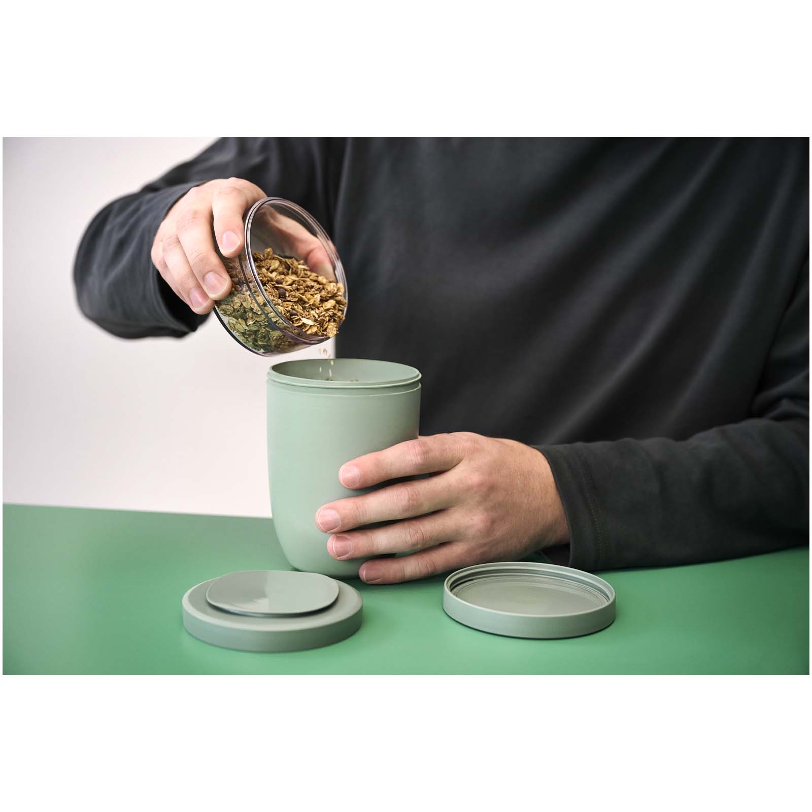 Termohrnec na jídlo se dvěma oddělenými přihrádkami pro úhledné oddělení ingrediencí. Každá nádoba má vlastní víko, díky kterému nedochází k mísení, proto je ideální pro jídla s polevami, přílohami nebo dresinky. Udrží jídlo teplé 6–8 hodin a studené až 12 hodin. Horní průhledná nádoba má objem 300 ml, zatímco ta spodní pojme 750 ml. Vnější strana je vyrobena z odolných materiálů, takže zůstává chladná a suchá na dotek. Doporučuje se ruční mytí. Plastové komponenty víka lze mýt v myčce. Neobsahuje BPA.