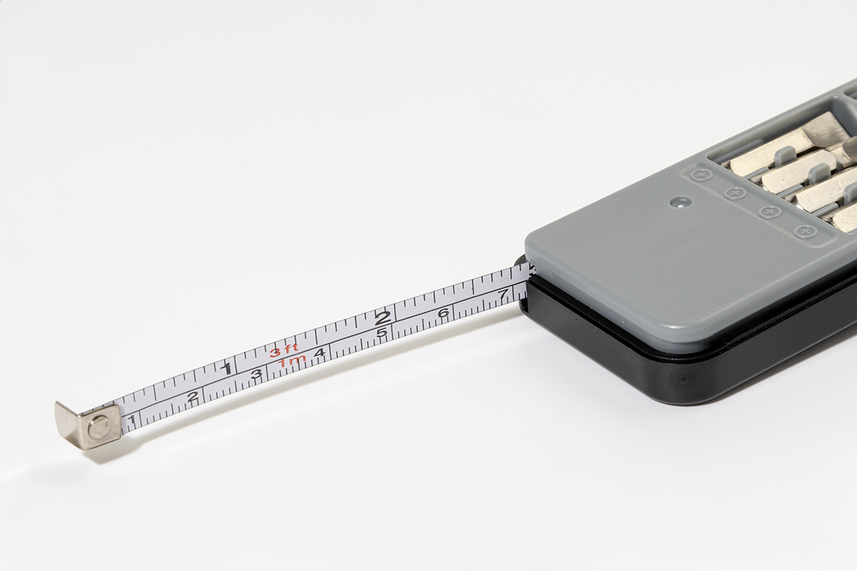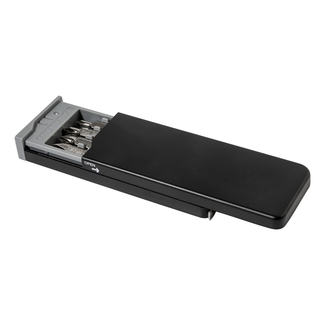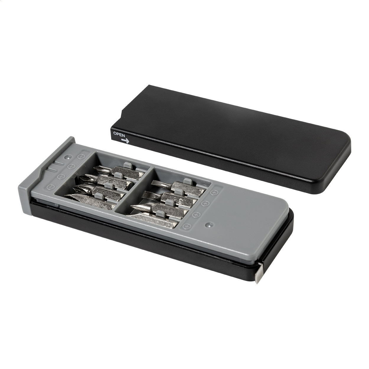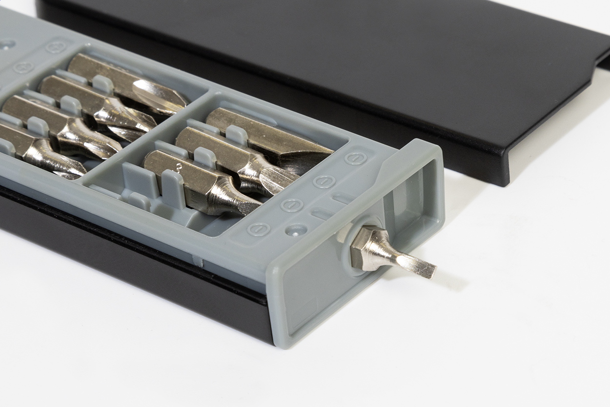 Kompaktní sada nářadí v pouzdře z recyklovaného ABS materiálu s 8 šroubovacími bity a vestavěným 1m metrem.