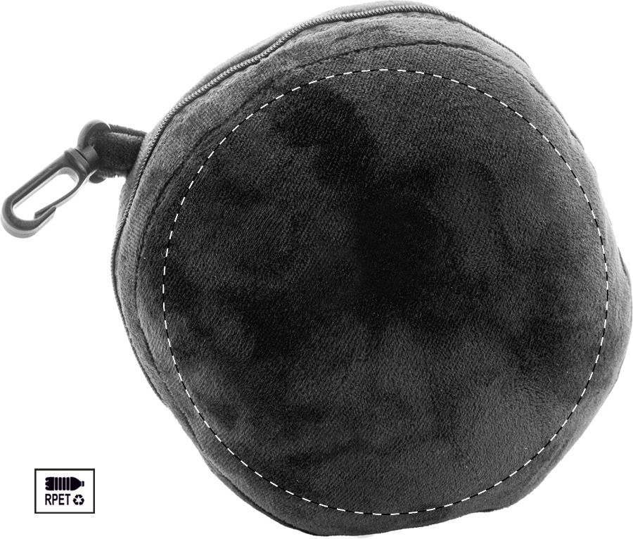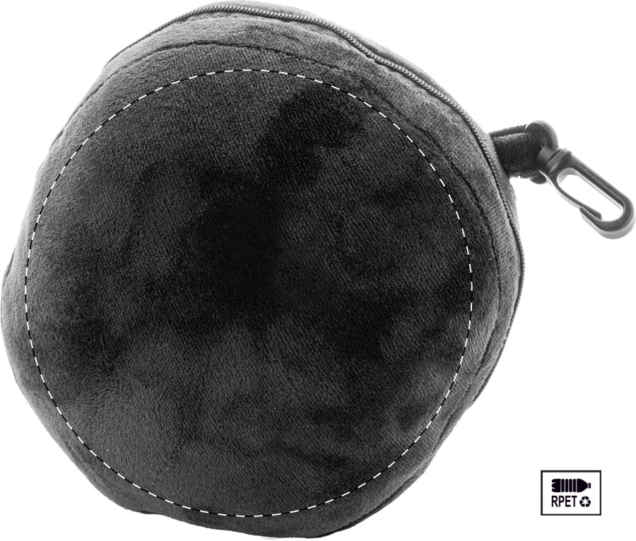 Cestovní polštář z RPET polyesteru s integrovanou oční maskou a elastickými popruhy. Zapíná se do kompaktního kulovitého tvaru pro snadné skladování a obsahuje karabinu z PP pro připevnění k zavazadlu. S výraznou etiketou z RPET.