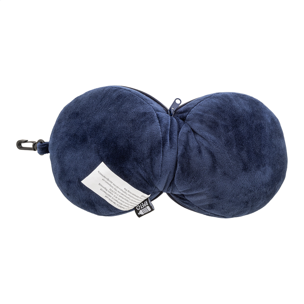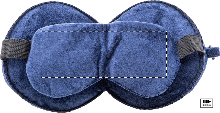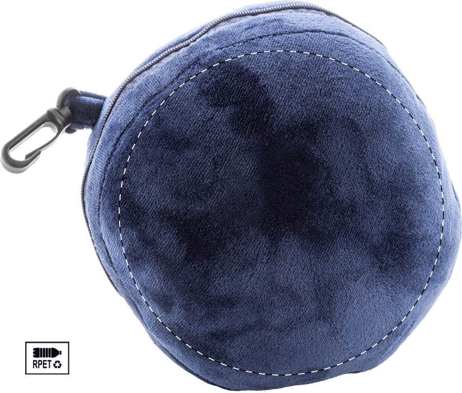 Cestovní polštář z RPET polyesteru s integrovanou oční maskou a elastickými popruhy. Zapíná se do kompaktního kulovitého tvaru pro snadné skladování a obsahuje karabinu z PP pro připevnění k zavazadlu. S výraznou etiketou z RPET.