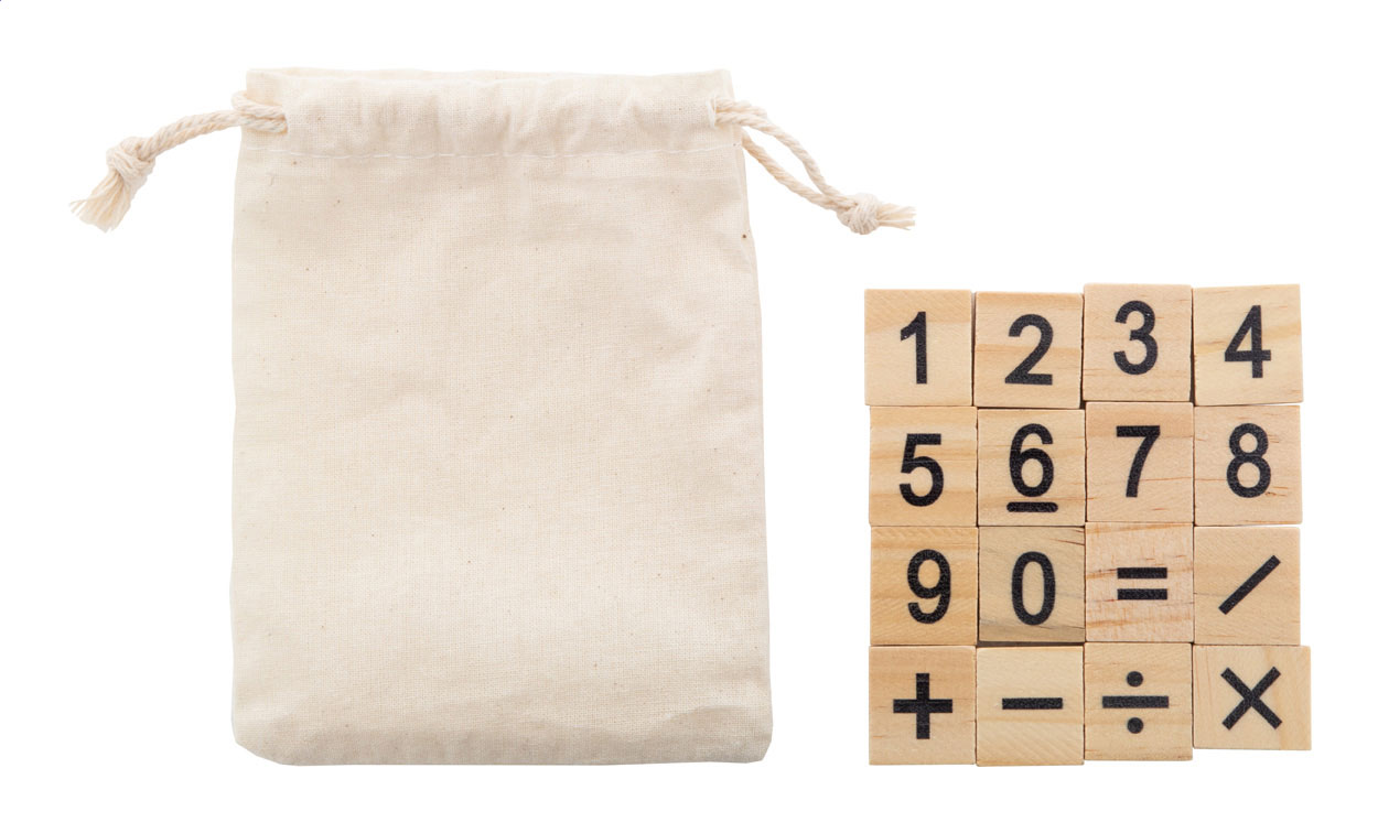Dřevěná vzdělávací hra na počítání v bavlněném sáčku se stahovací šňůrkou. S 32 dílky, včetně čísel a matematických operací.