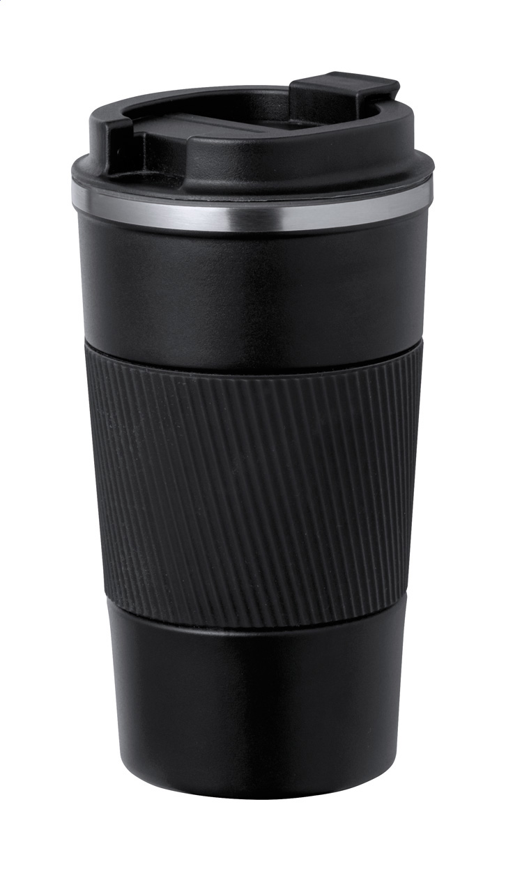 Dvoustěnný, nerezový izolovaný termo hrnek s víčkem na pití a silikonovým páskem, 400 ml.
