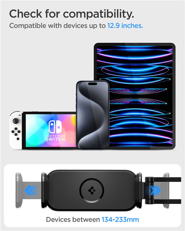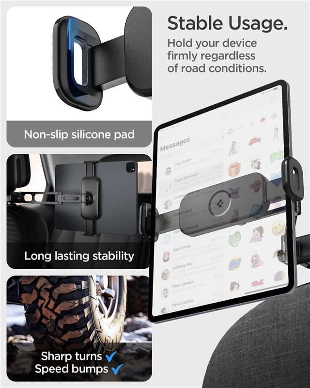 Univerzální držák Spigen OneTap pro tablet se upevňuje na tyče opěrky hlavy v rozmezí 95 mm až 150 mm a zajišťuje zábavu cestujícím na zadních sedadlech. Kovový rám poskytuje mimořádnou stabilitu pro zařízení s úhlopříčkou až 12,9 palce.