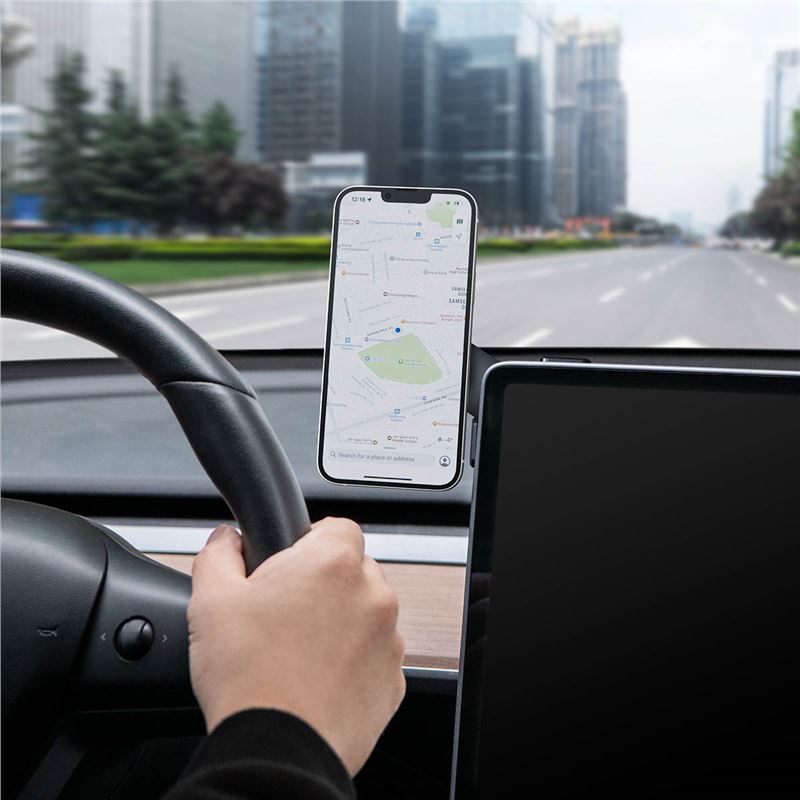 Magnetický držák pro montáž na displej vozů Tesla Model 3, Y, X a S poskytuje bezpečné místo pro iPhone 12 a novější modely. Pevné uchycení zajišťuje speciální páska nezanechávající stopy, zatímco silné magnety s technologií OneTap okamžitě fixují telefon v požadované pozici.
