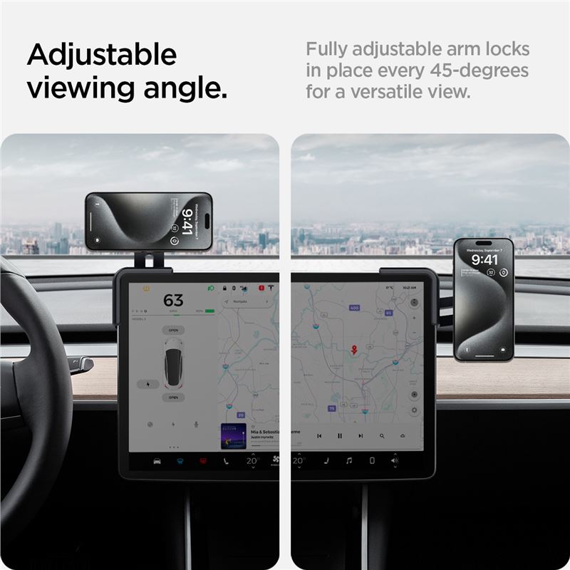 Magnetický držák telefonu tvoří stabilní základnu pro iPhone 12 a novější modely přímo na okraji displeje vozů Tesla Model 3, Y, X, S nebo Cybertruck. Pevný mechanismus TapLock se uchycuje na hranu obrazovky, čímž zajišťuje nerušený výhled a snadný přístup k navigaci. Silné magnety spolehlivě zafixují telefon i v náročném terénu nebo při prudkém brzdění.