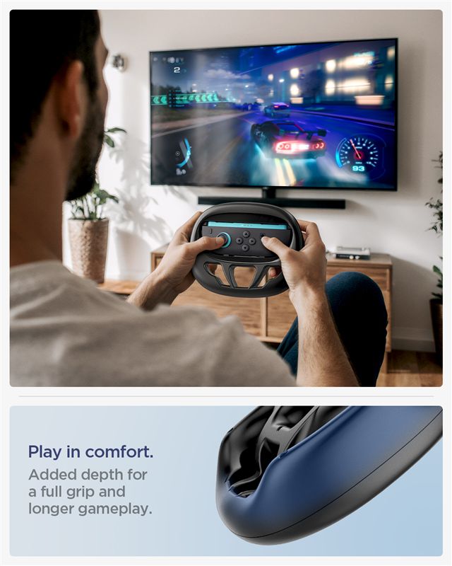 Sada dvou ergonomických držáků ve tvaru volantu proměňuje ovladače Joy-Con pro Nintendo Switch 2 (2025) v realistický herní doplněk pro závodní simulátory. Kompaktní a lehké provedení z kvalitního plastu zachovává plnou obratnost ovládání bez nárůstu hmotnosti, zatímco protiskluzové gumové vložky fixují ovladač pevně na místě.