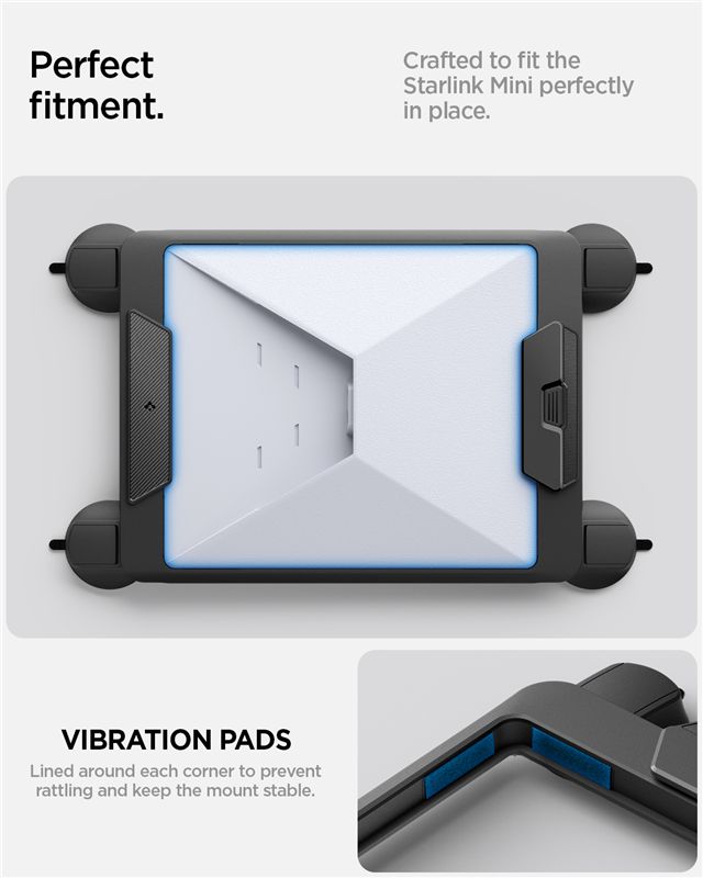 Speciální držák pro Starlink Mini umožňuje bezpečné upevnění satelitního terminálu přímo na sklo vozidla pomocí čtyř výkonných přísavek. Otevřená konstrukce neblokuje výhled na oblohu a zajišťuje nerušený příjem signálu i během pohybu. Lehký, ale odolný plastový rám chrání zařízení před pádem a udržuje ho v optimální poloze pro stabilní připojení k internetu.