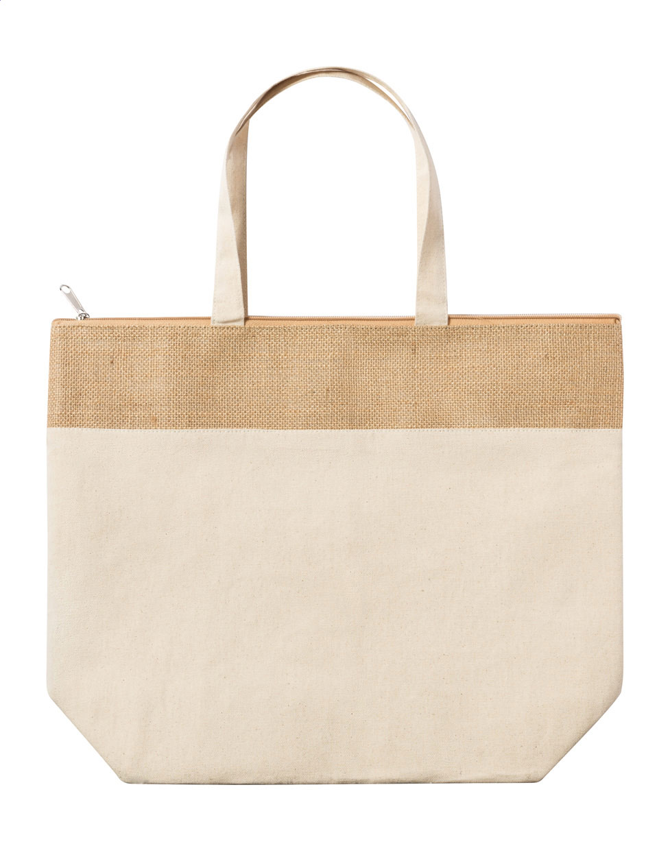 Chladicí nákupní taška vyrobená ze 100% bavlny a laminované juty. Hlavní prostor s uzavíráním na zip je vyložený hliníkovou folií.