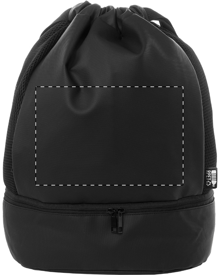 Prémiový vak se stahovací šňůrkou z RPET s přihrádkou na boty na zip, bočními vložkami ze síťoviny a širokými popruhy. Polyester 600D RPET potažený PU s výrazným štítkem RPET.
