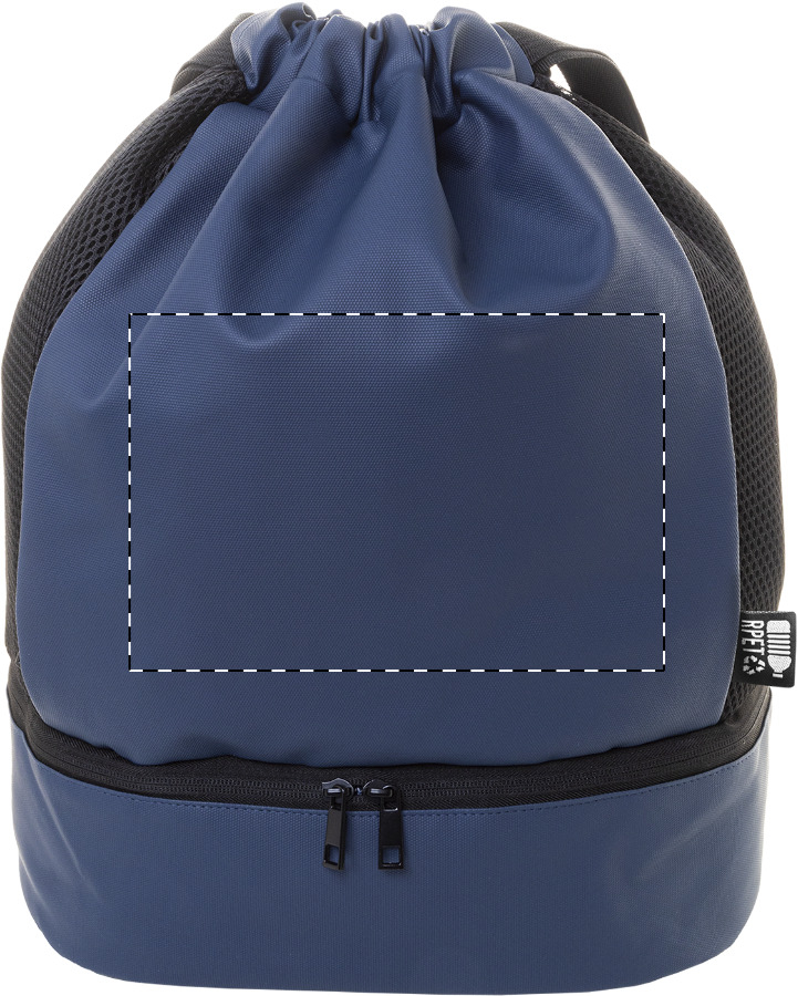 Prémiový vak se stahovací šňůrkou z RPET s přihrádkou na boty na zip, bočními vložkami ze síťoviny a širokými popruhy. Polyester 600D RPET potažený PU s výrazným štítkem RPET.