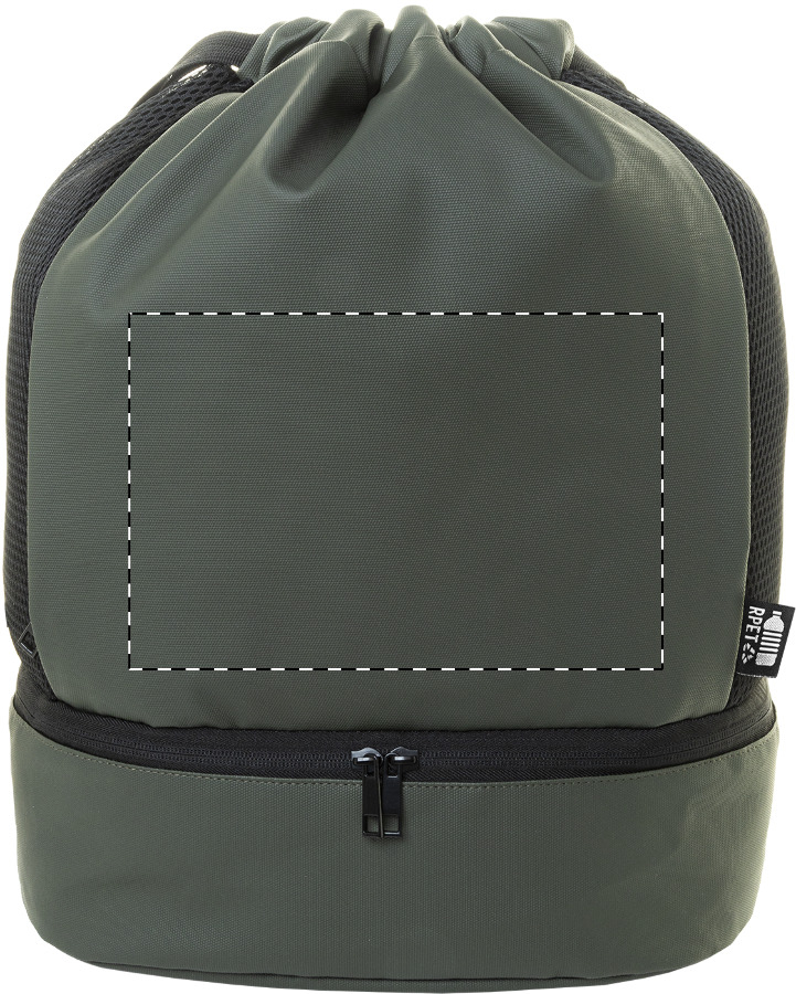 Prémiový vak se stahovací šňůrkou z RPET s přihrádkou na boty na zip, bočními vložkami ze síťoviny a širokými popruhy. Polyester 600D RPET potažený PU s výrazným štítkem RPET.
