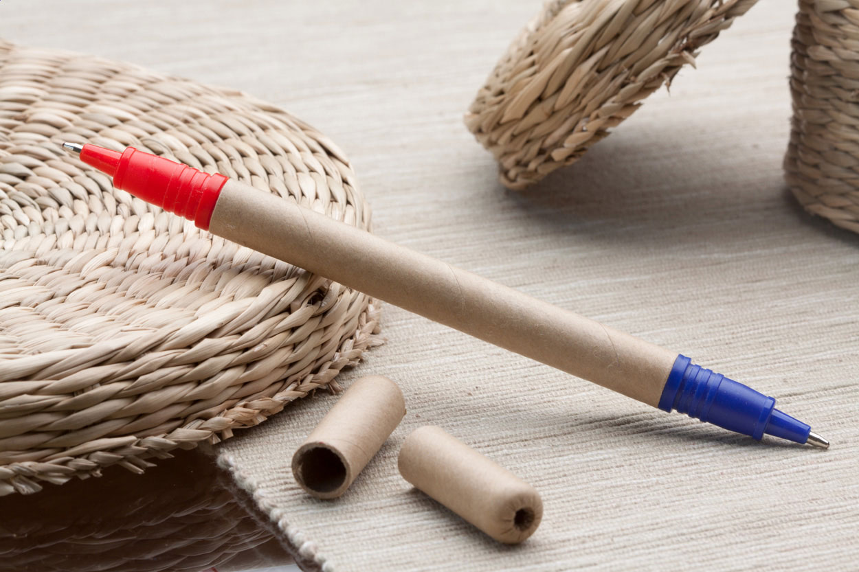 Oboustranné kuličkové pero z recyklovaného papíru s červenou a modrou náplní.