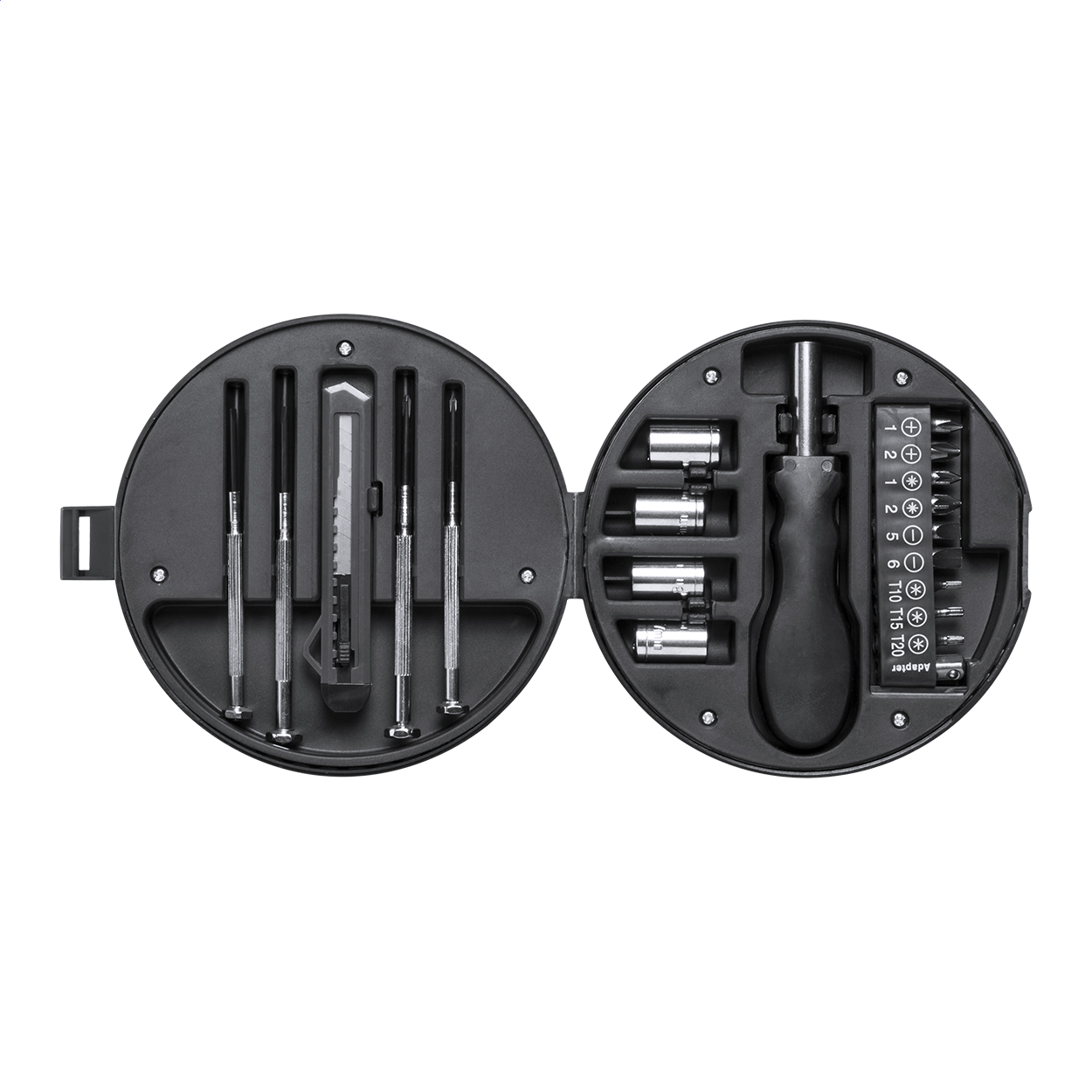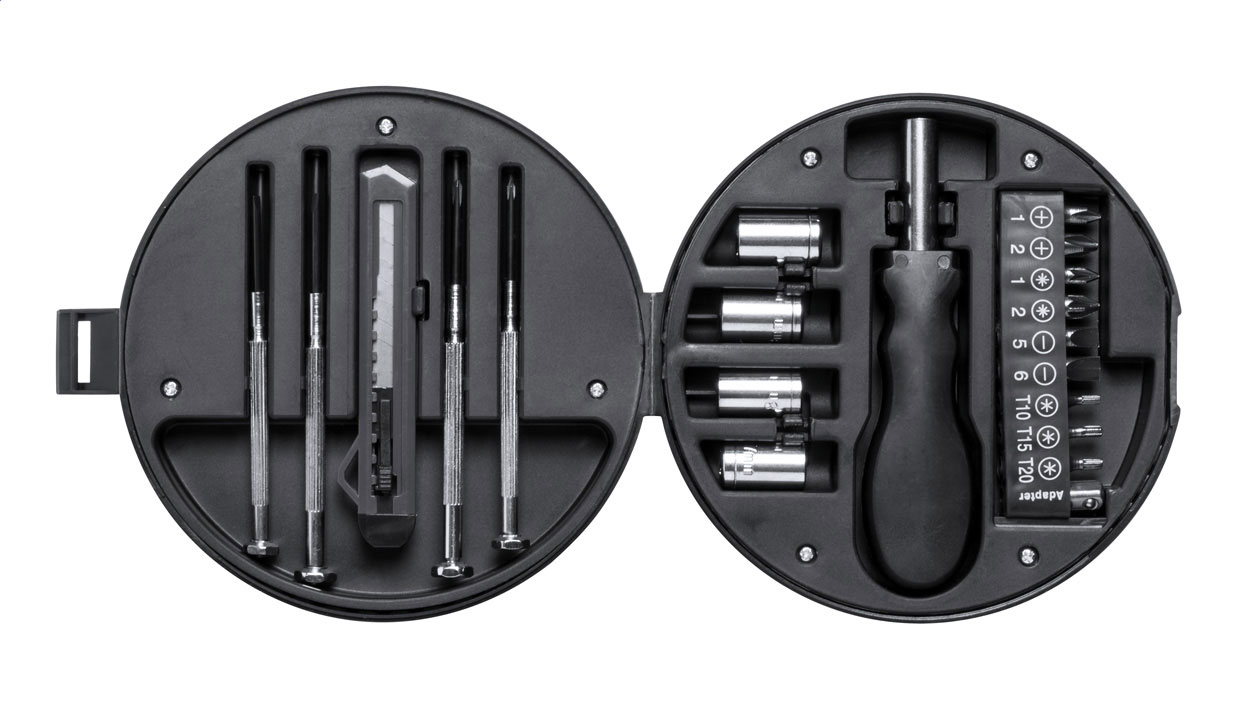 20dílný set nářadí v plastovém obalu ve tvaru kola od automobilu.