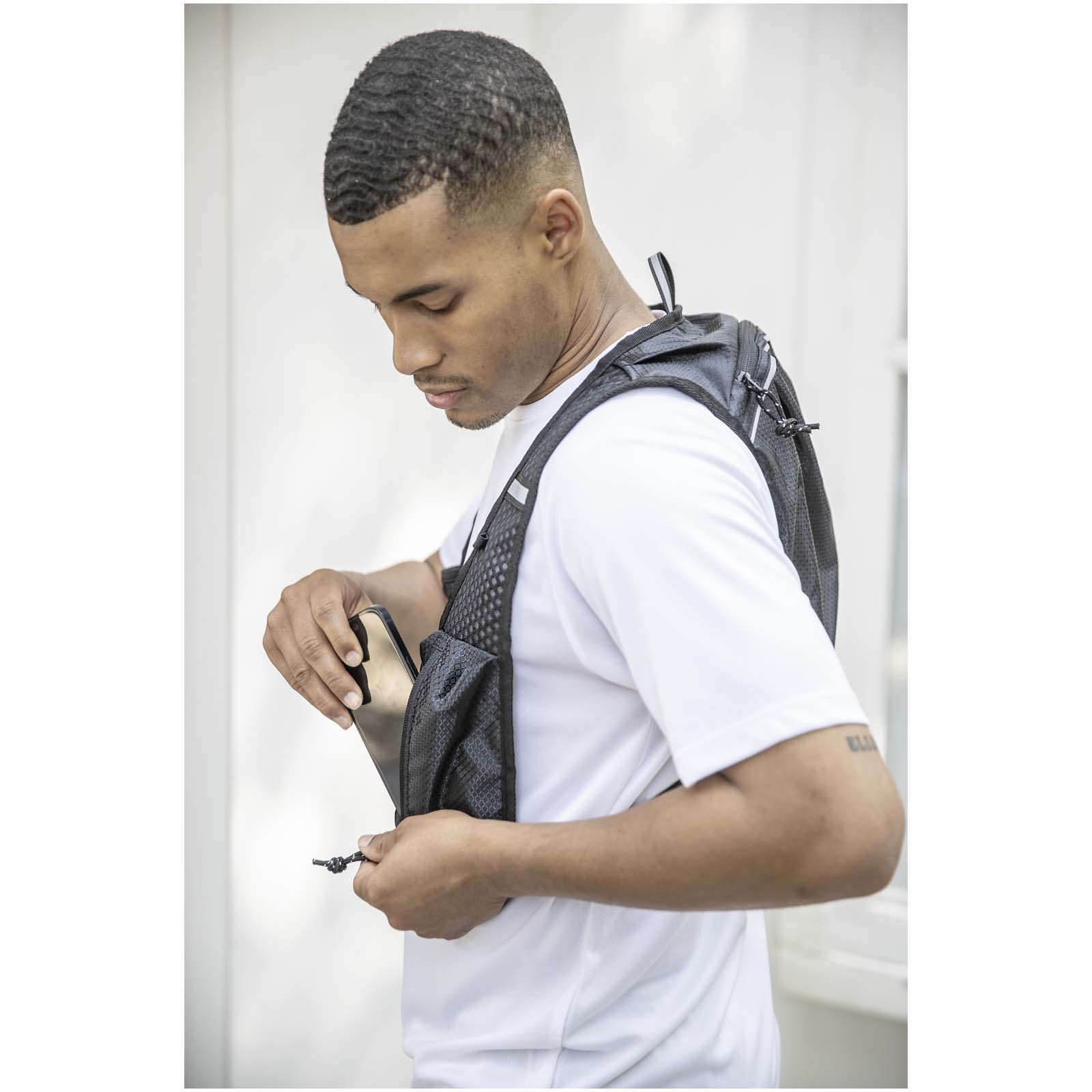 Běžecká hydratační vesta Nomad je vyrobena z recyklované ripstopové tkaniny s certifikací GRS a vodoodpudivou úpravou. Obsahuje podšívku z RPET s certifikací GRS a reflexní prvky pro lepší viditelnost. Vesta je určena pro běh na dlouhé tratě, použití v terénu a lehké outdoorové aktivity. Zadní část vesty má prodyšný síťovaný design pro větší pohodlí. Součástí jsou nastavitelné ramenní popruhy a dvě přední náprsní kapsy na láhve, drobné doplňky nebo mobilní telefon. Uvnitř je samostatný prostor pro 1,5litrový hydratační vak (není součástí balení). Objemová kapacita: 5 litrů.
