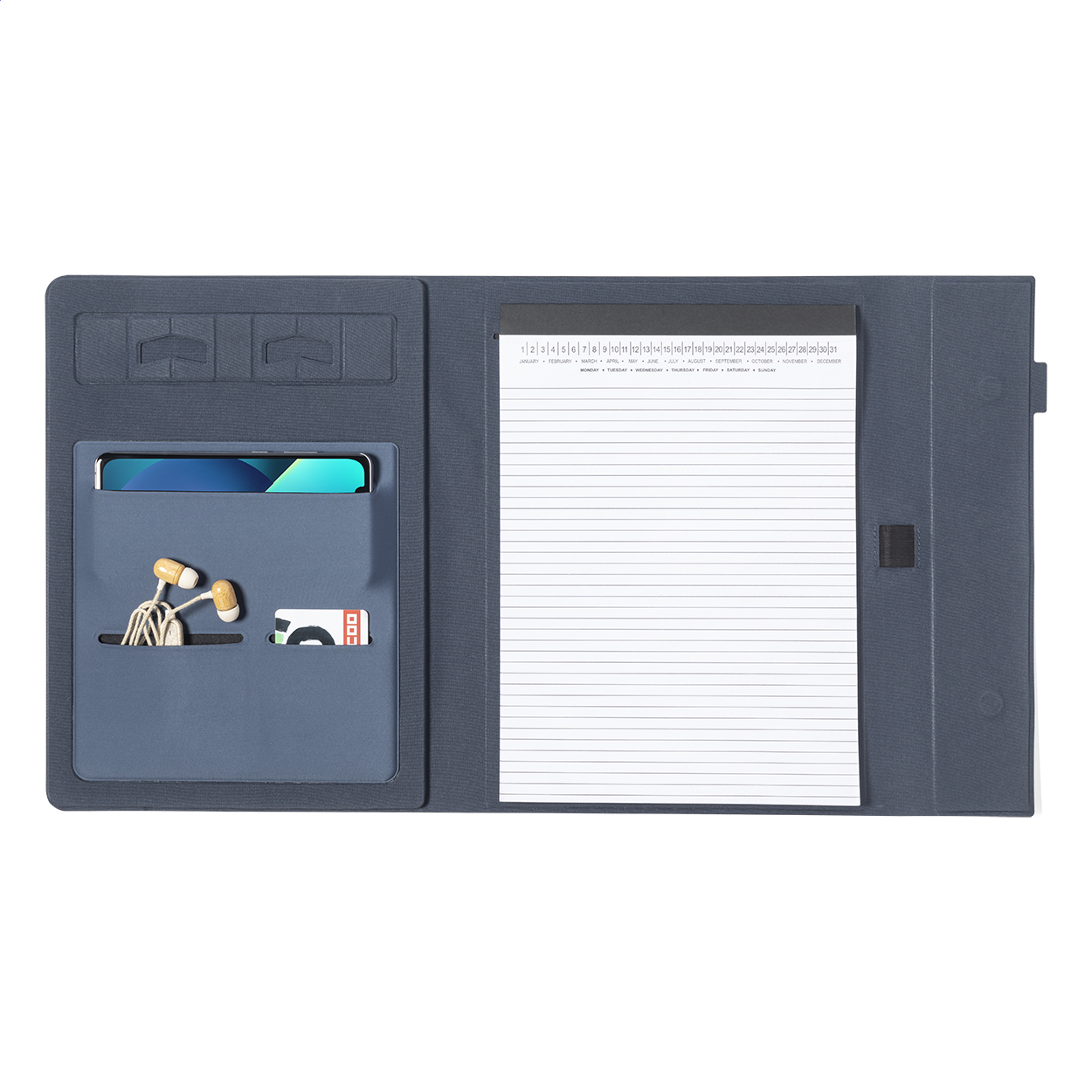 Polyesterová složka na dokumenty A4 z 600D RPET s magnetickým zavíráním, skládacím držákem na mobil a poznámkovým blokem (20 linkovaných listů).